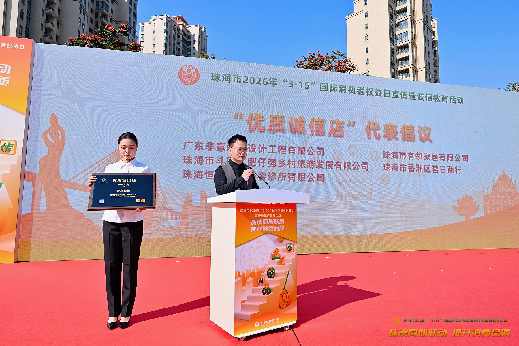 在近日舉行的珠港澳誠(chéng)信店合作共建大會(huì)上,非意裝飾憑借持續(xù)的誠(chéng)信經(jīng)營(yíng)表現(xiàn),正式獲評(píng) 「2025 年度珠港澳優(yōu)質(zhì)誠(chéng)信店」,并被授予黑金榮譽(yù)牌匾。