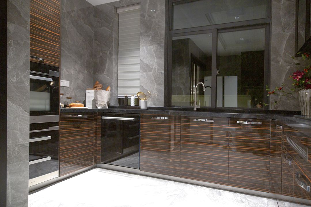 廚房棕色紋理櫥柜低調(diào)沉穩(wěn),柜體造型線條簡單,方便日常清潔,減少污垢。推拉玻璃門方便家庭成員在烹飪和用餐時的交流互動。