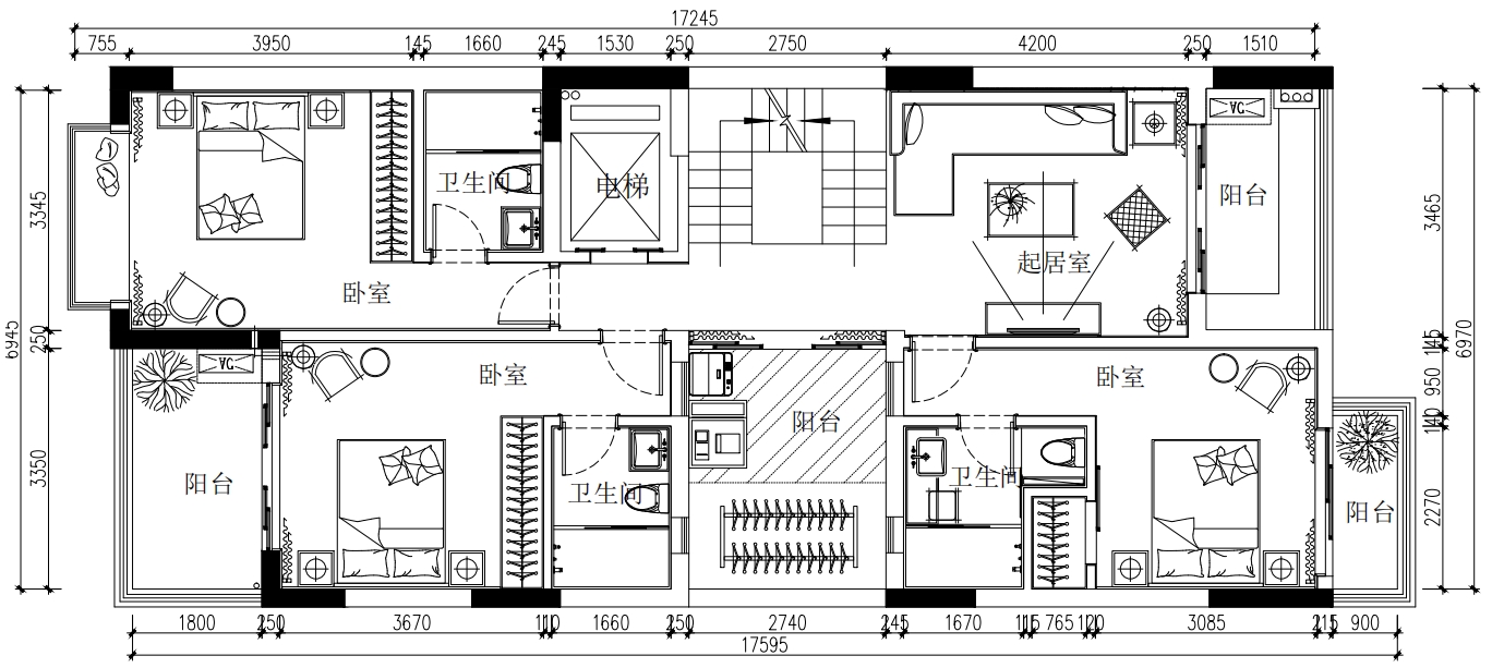 深色的衣柜考慮使用便捷性,內(nèi)部空間分區(qū)明確,頂層放置過季衣物,下層設(shè)計掛衣區(qū),滿足不同收納需求。