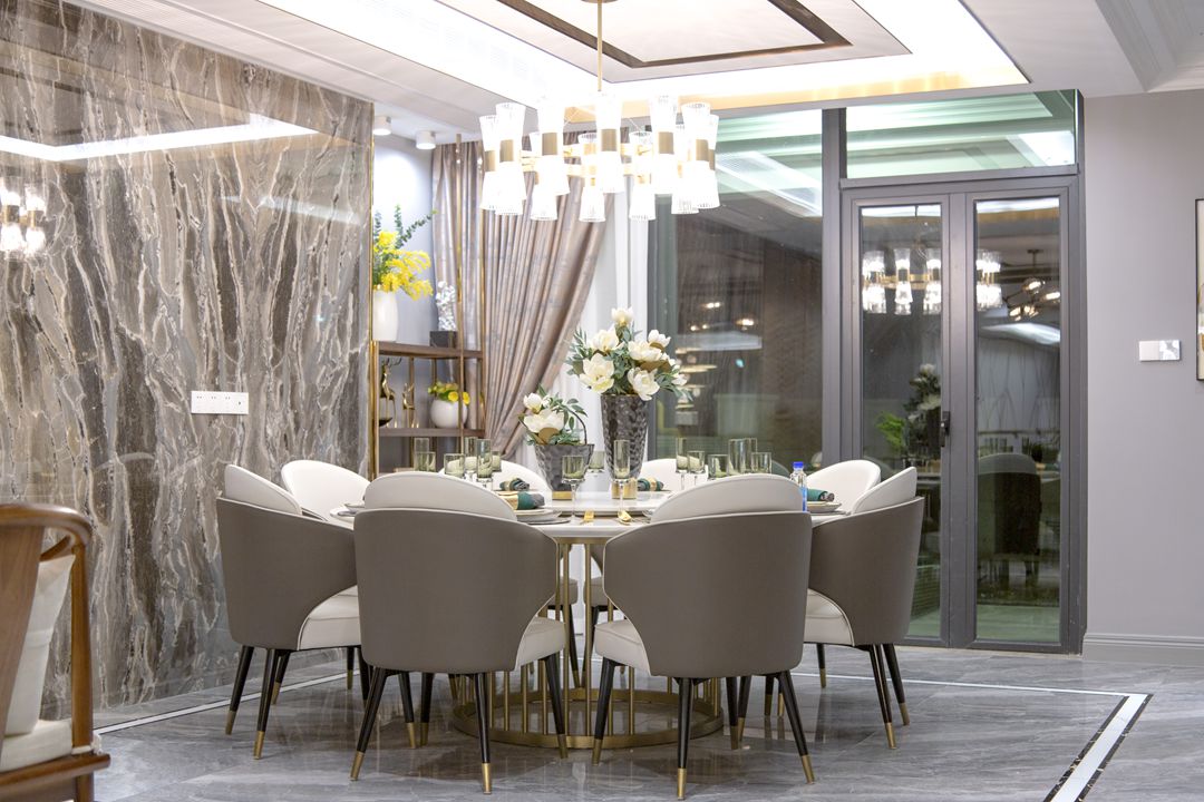 餐廳圓桌位于中心位置,環(huán)繞動線活動空間充足,搭配吸睛的大吊燈突出圓桌,整體與地板大理石瓷磚紋理相得益彰。一旁的品茶區(qū)設(shè)計棕色餐桌椅搭配淺色墻,別有一番韻味,帶來不一樣的品茶環(huán)境。