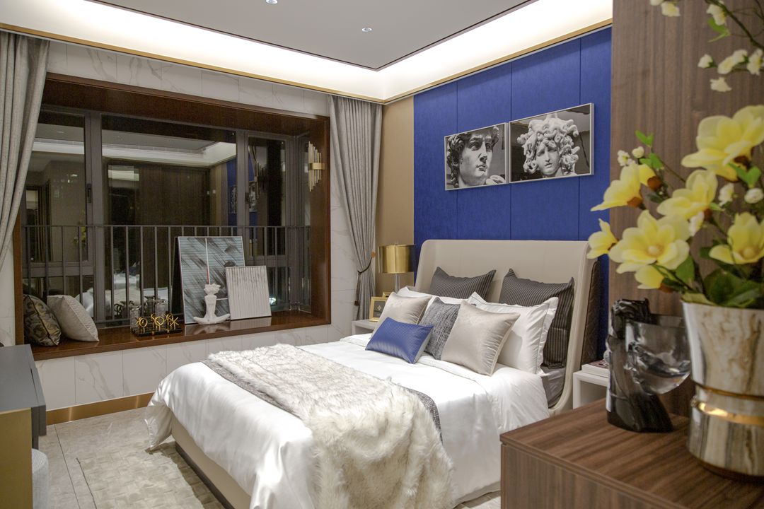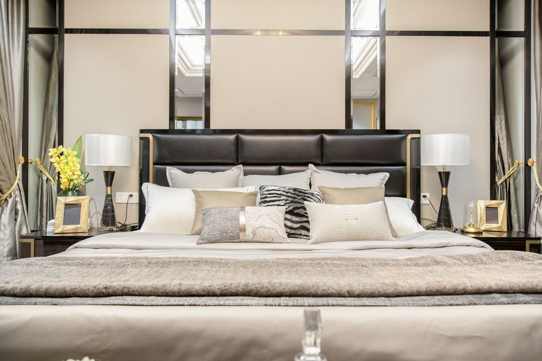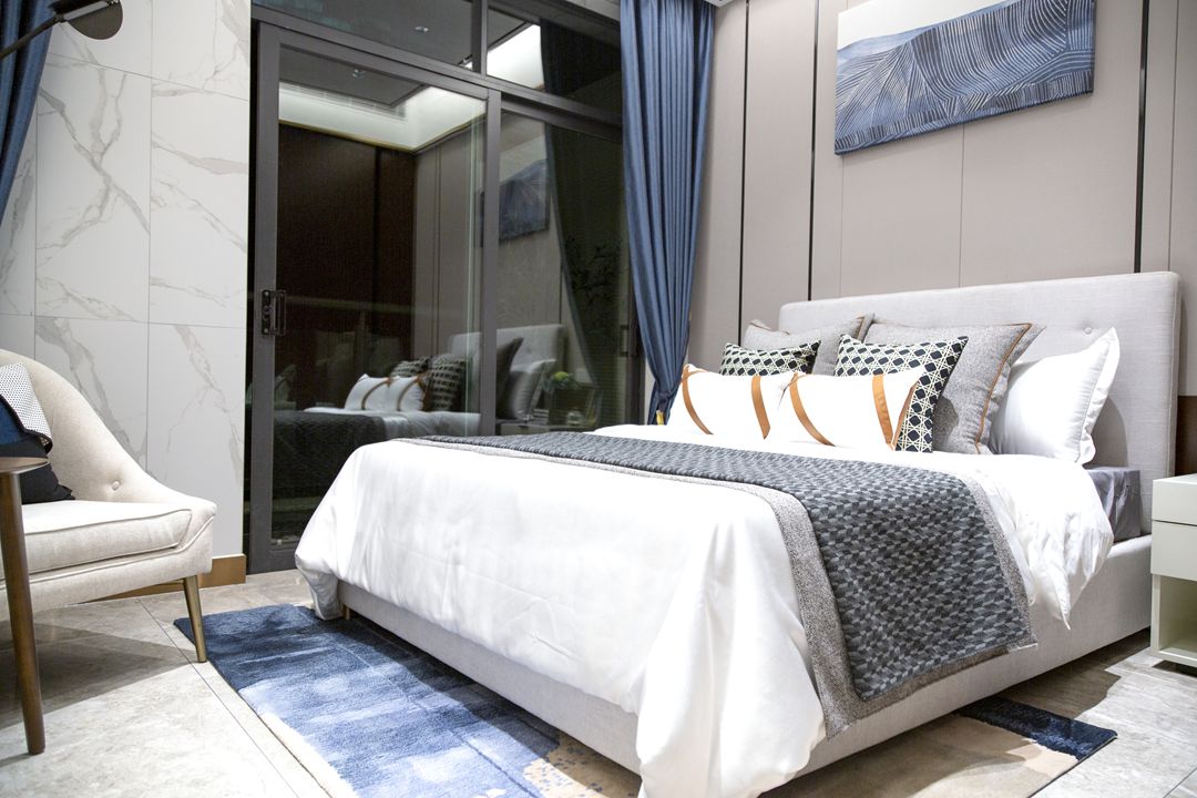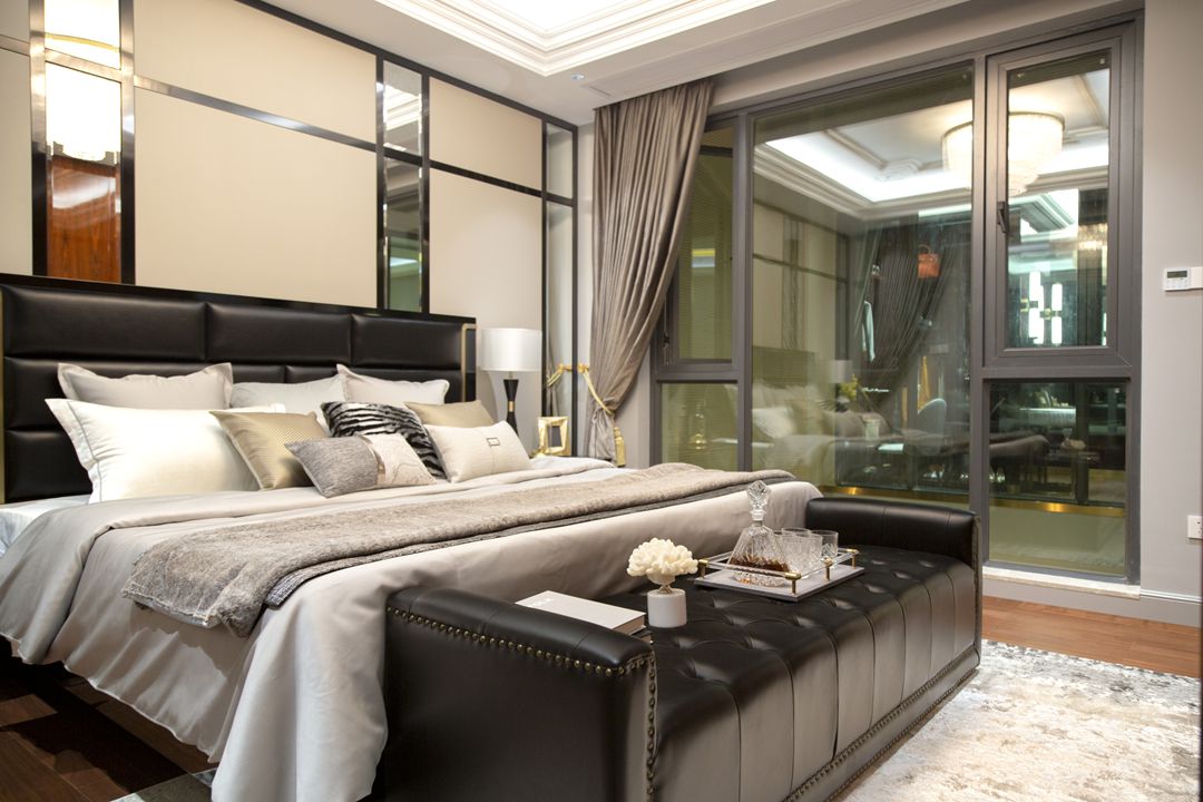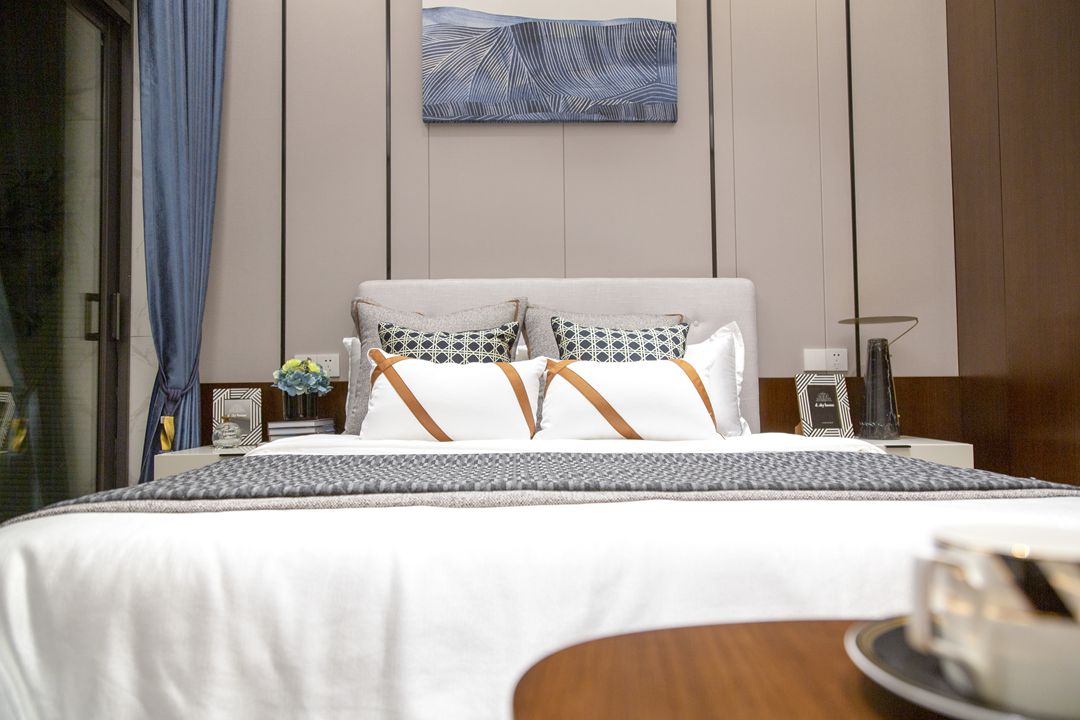 主臥的設(shè)計注重低調(diào)與舒適,黑色皮質(zhì)床自帶高級感,床尾春凳作為床的延伸,閑坐和放置物品都很方便。床頭背景墻為避免單調(diào),使用硬朗交錯線條,凸顯設(shè)計層次感,提高空間質(zhì)感。