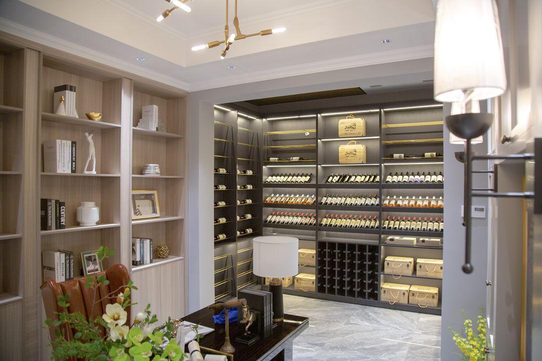 酒窖以深色酒架與冷色調(diào)石材作為主材料,營造出濃郁的品鑒氛圍,根據(jù)葡萄酒的儲藏要求,設(shè)計師還考慮恒溫恒濕的效果,避免高熱度燈光。