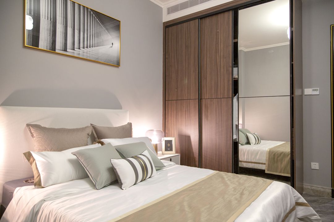保姆房為了不讓空間單調(diào),做了簡單軟裝,深色木制衣柜點綴,形成既舒適又私密的休息居所。