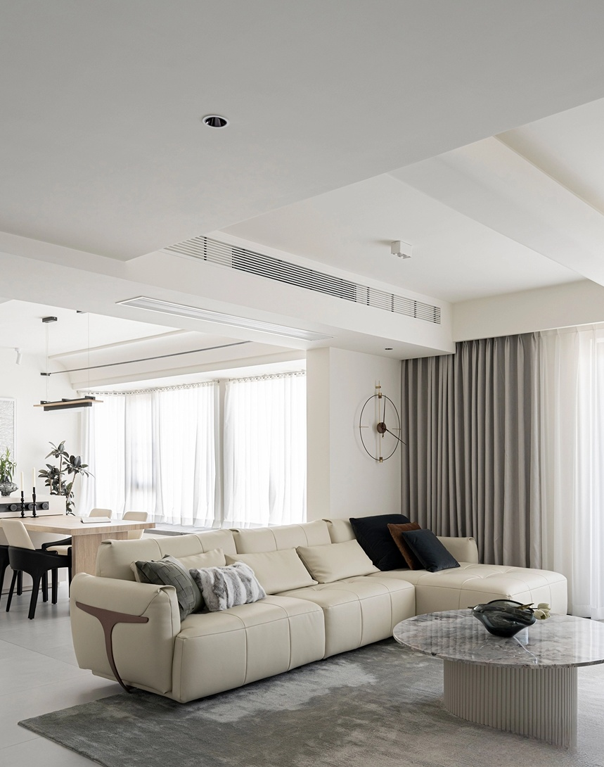 奶油色沙發(fā)、木飾面的餐桌、地毯選擇了高級(jí)灰,低飽和度色彩搭配上少許木色,統(tǒng)一的美感,使得整個(gè)空間簡(jiǎn)約而不單調(diào)。