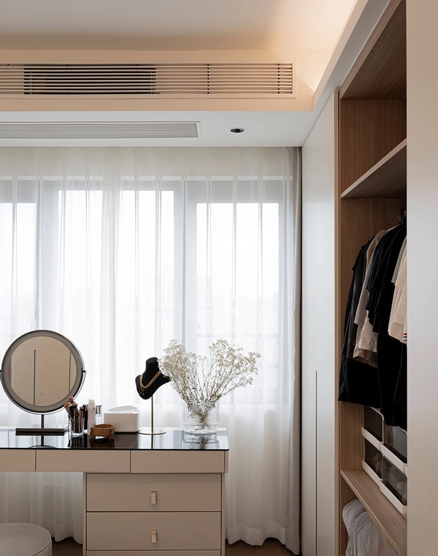 頂面是埋燈帶的造型吊頂,既能滿足空間的光感,又能保證空間的高度,不會(huì)讓人一進(jìn)門(mén)就有種壓抑的感覺(jué)。