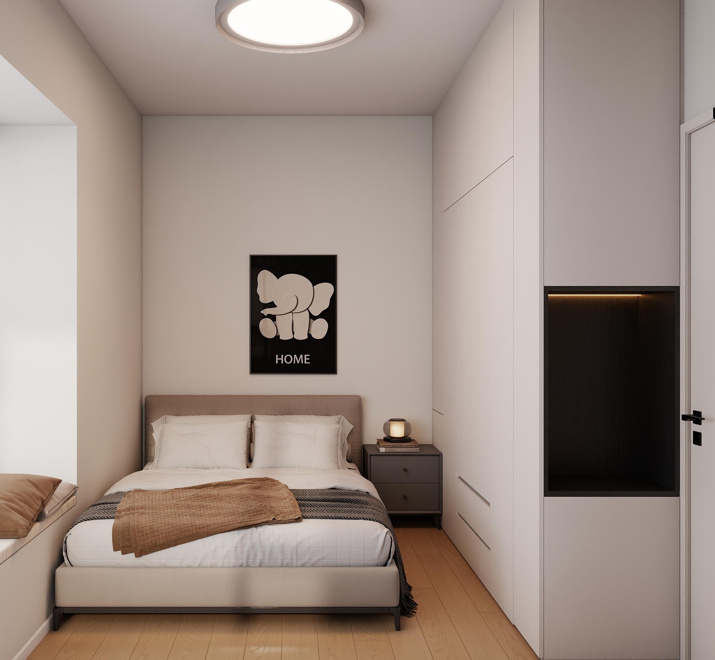 次臥:在裝修風(fēng)格選擇上,次臥風(fēng)格與整體家居風(fēng)格相契合,同時(shí)兼顧使用者的個(gè)人喜好。現(xiàn)代簡(jiǎn)約風(fēng)格以簡(jiǎn)潔線條、淺淡色調(diào)與實(shí)用家具,打造出清爽舒適的空間。巧用亮色主調(diào)能極大提升室內(nèi)亮度,讓空間視覺(jué)上更顯開(kāi)闊。像淺色系的墻面漆、明亮的窗簾,搭配光線柔和的燈具,可營(yíng)造出溫馨且敞亮的氛圍。