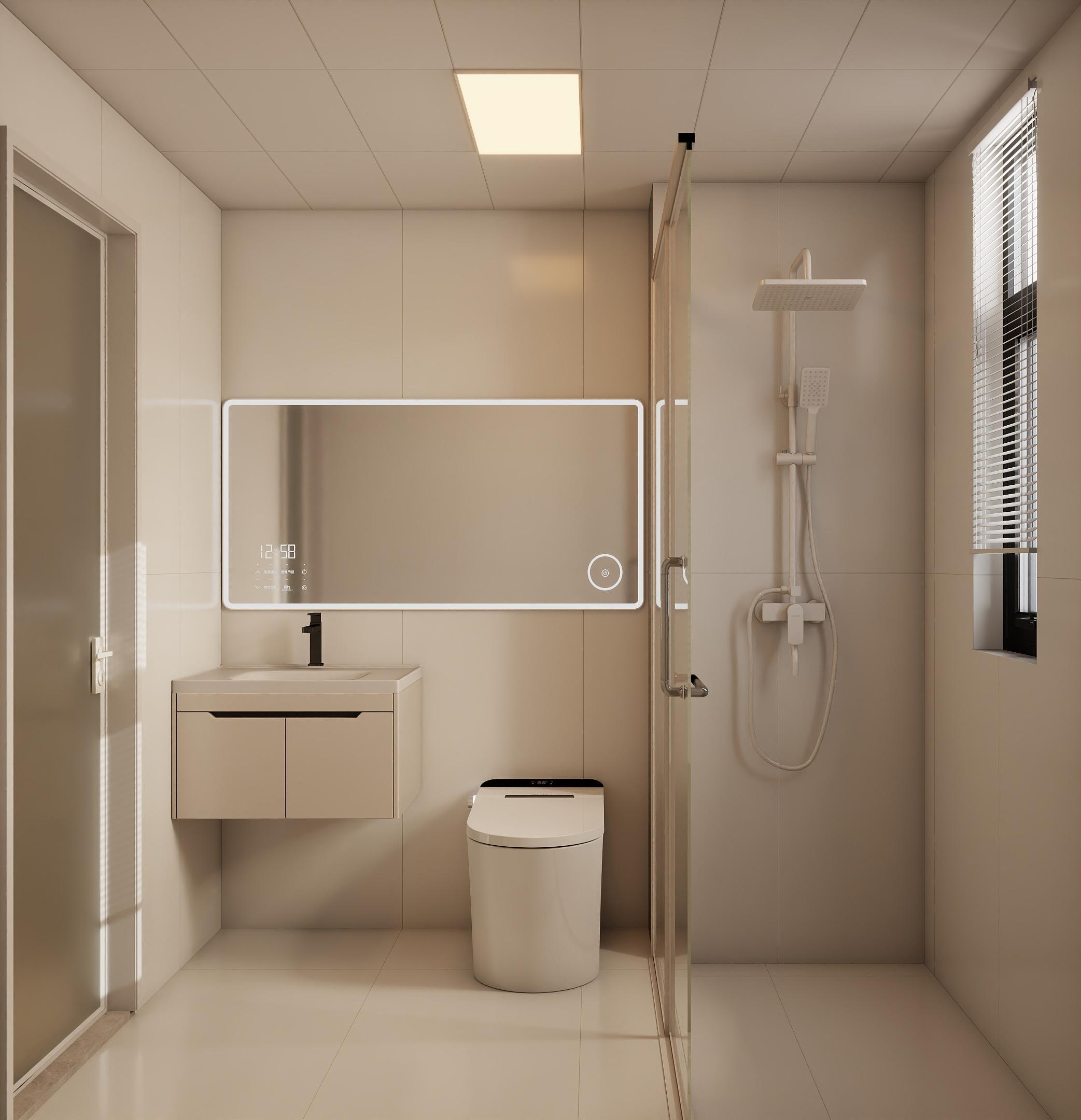 墻面、地面選用淺色瓷磚,搭配原木色的浴室柜和鏡框,營造清新自然的氛圍,浴室柜選擇簡約設(shè)計,注重實用性和收納功能,合理規(guī)劃洗手臺、馬桶、淋浴區(qū)等區(qū)域,確保使用便捷,設(shè)置玻璃隔斷或浴簾,實現(xiàn)干濕分離。