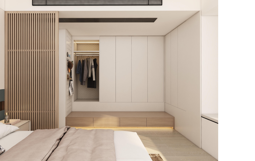 定制衣柜:主臥定制了整排的白色衣柜,提供了大量的衣物收納空間。衣柜部分柜門采用無把手設計,使外觀更加簡潔流暢。