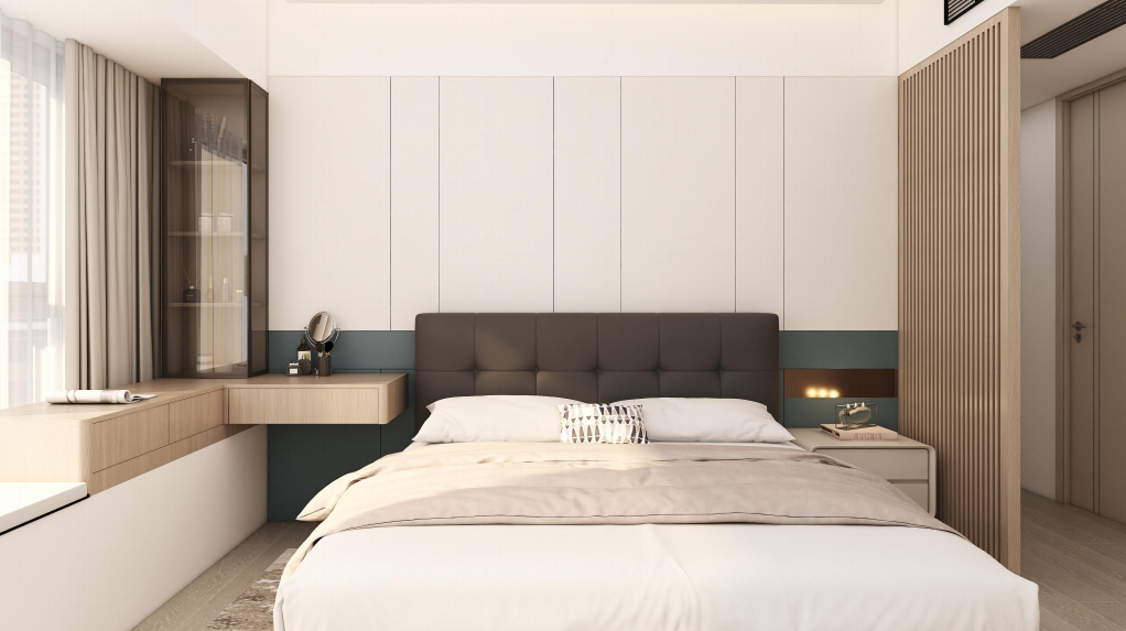 床頭背景墻:床頭背景墻采用白色與深綠色拼接的設計,簡潔而富有層次感。定制的懸空床頭柜與背景墻相連,節(jié)省空間且方便使用,上面擺放的圓形化妝鏡和化妝品增添了生活氣息。