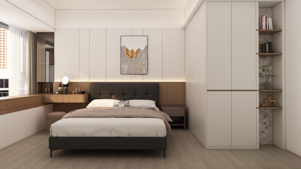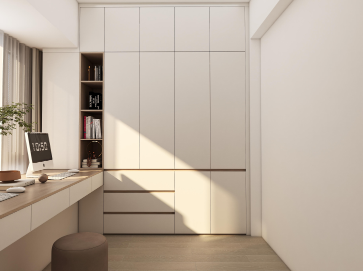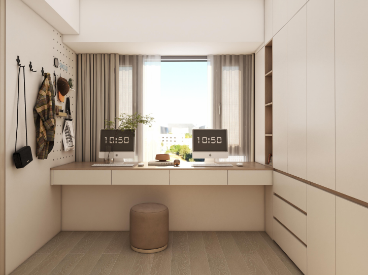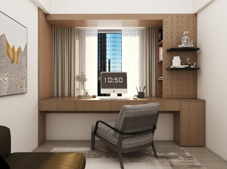 書桌與書架:窗邊定制了長書桌和書架,滿足了學習、工作的需求。書架上可以擺放書籍和裝飾品,增加了空間的文化氛圍。