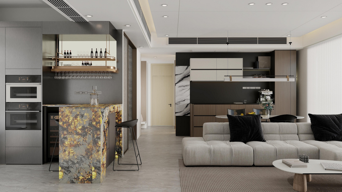 吧臺酒柜一體:客廳一側(cè)設(shè)置了特色吧臺,臺面采用帶有金色紋理的大理石材質(zhì),奢華且獨(dú)特。吧臺上方安裝了金屬酒架,可懸掛酒杯,旁邊還設(shè)置了擺放酒瓶的擱架,既實(shí)用又起到裝飾作用,成為客廳的一個亮點(diǎn)區(qū)域,增添了生活情調(diào)。
