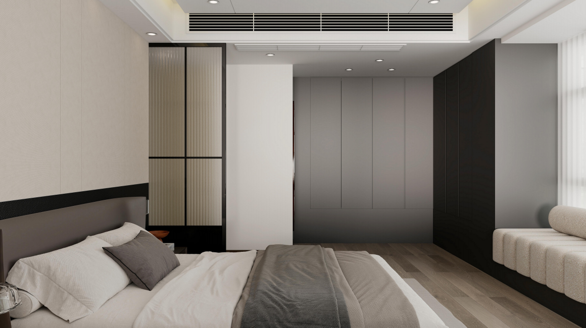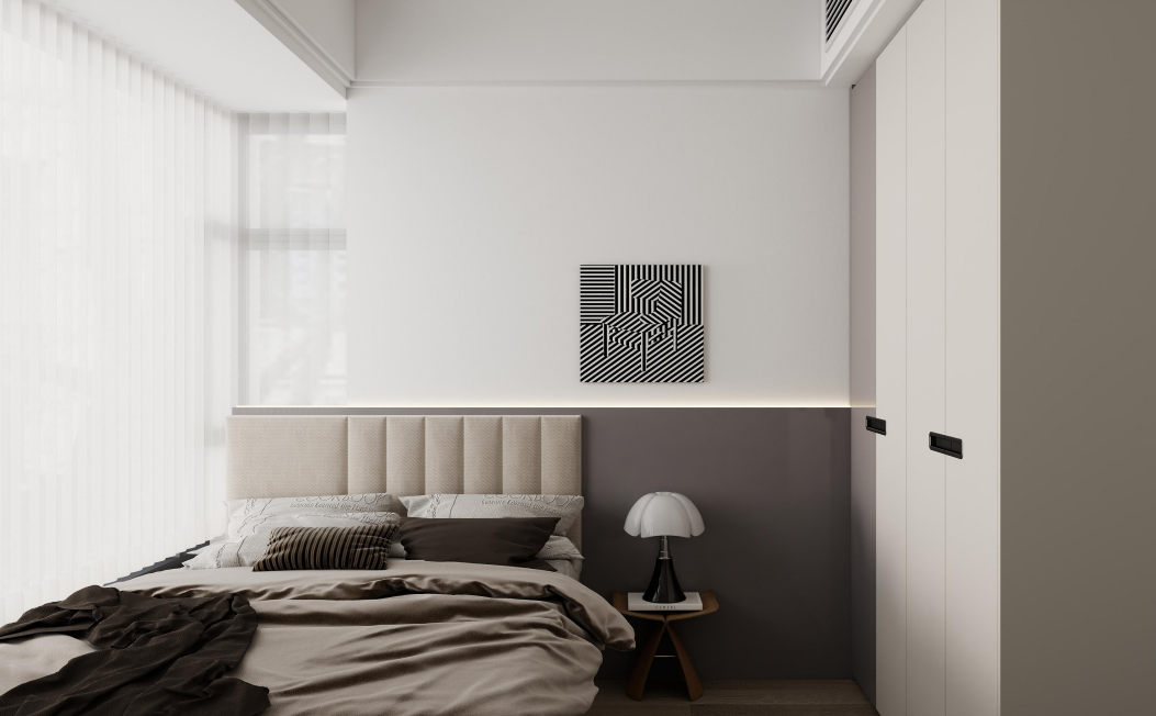 主臥定制了大型的到頂衣柜,提供了充足的衣物收納空間。床頭背景墻采用白色與深灰色的分色設(shè)計(jì),搭配簡約的黑白條紋裝飾畫,營造出寧靜而溫馨的氛圍。