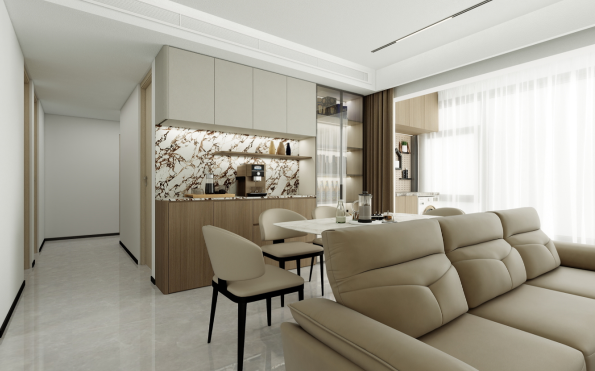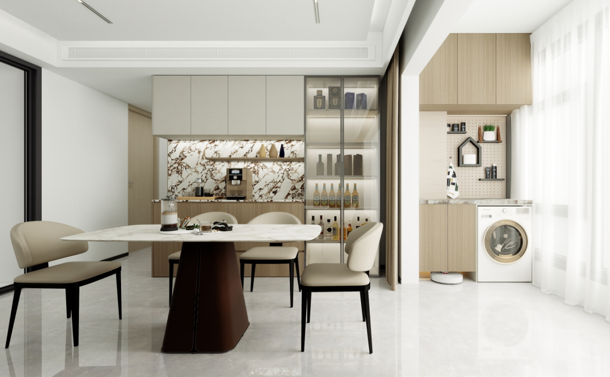 餐廳區(qū)域:餐桌采用大理石臺(tái)面,搭配淺色餐椅,顯得干凈利落。餐邊柜設(shè)計(jì)巧妙,既有封閉的儲(chǔ)物空間,又有開放的展示架,方便存放和展示各種物品。背景墻的大理石紋理與餐桌相呼應(yīng),整體協(xié)調(diào)統(tǒng)一。