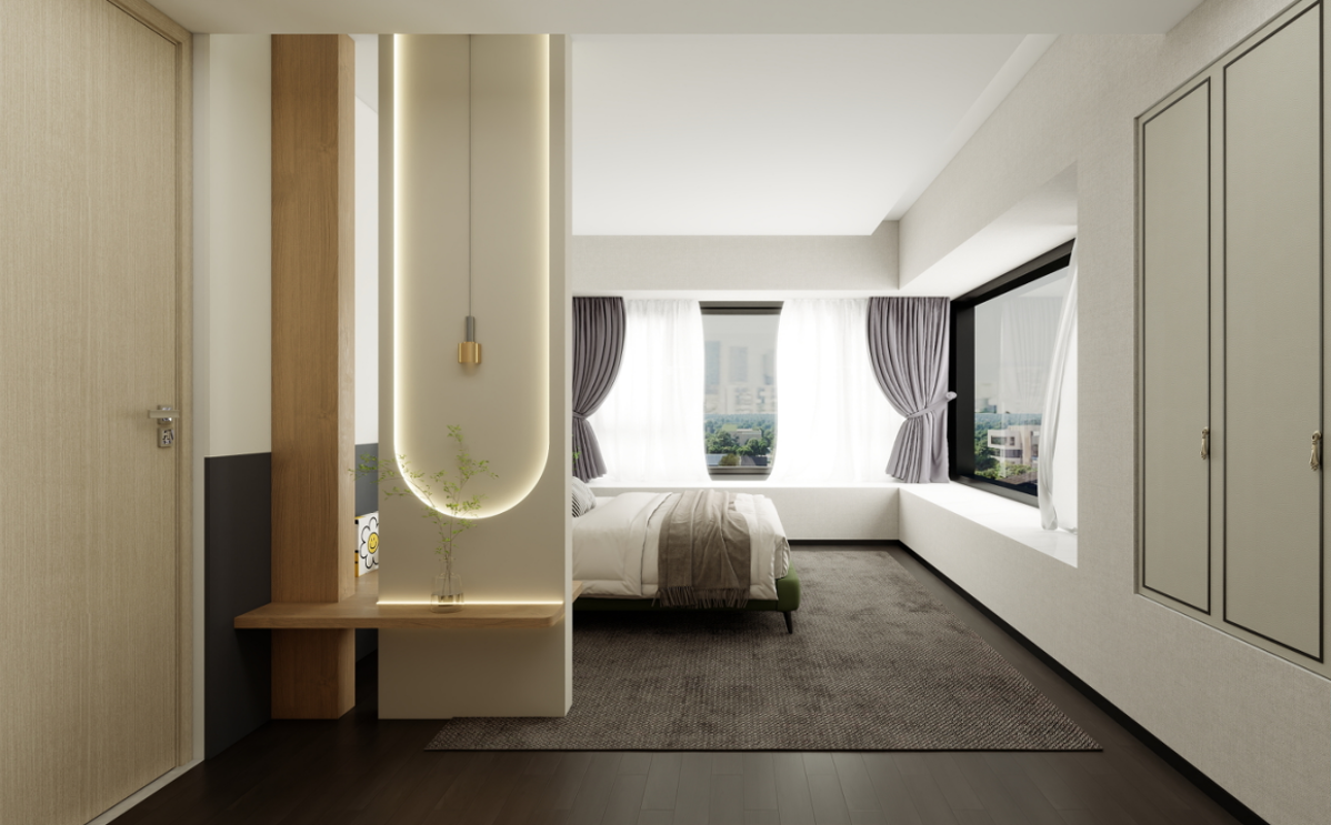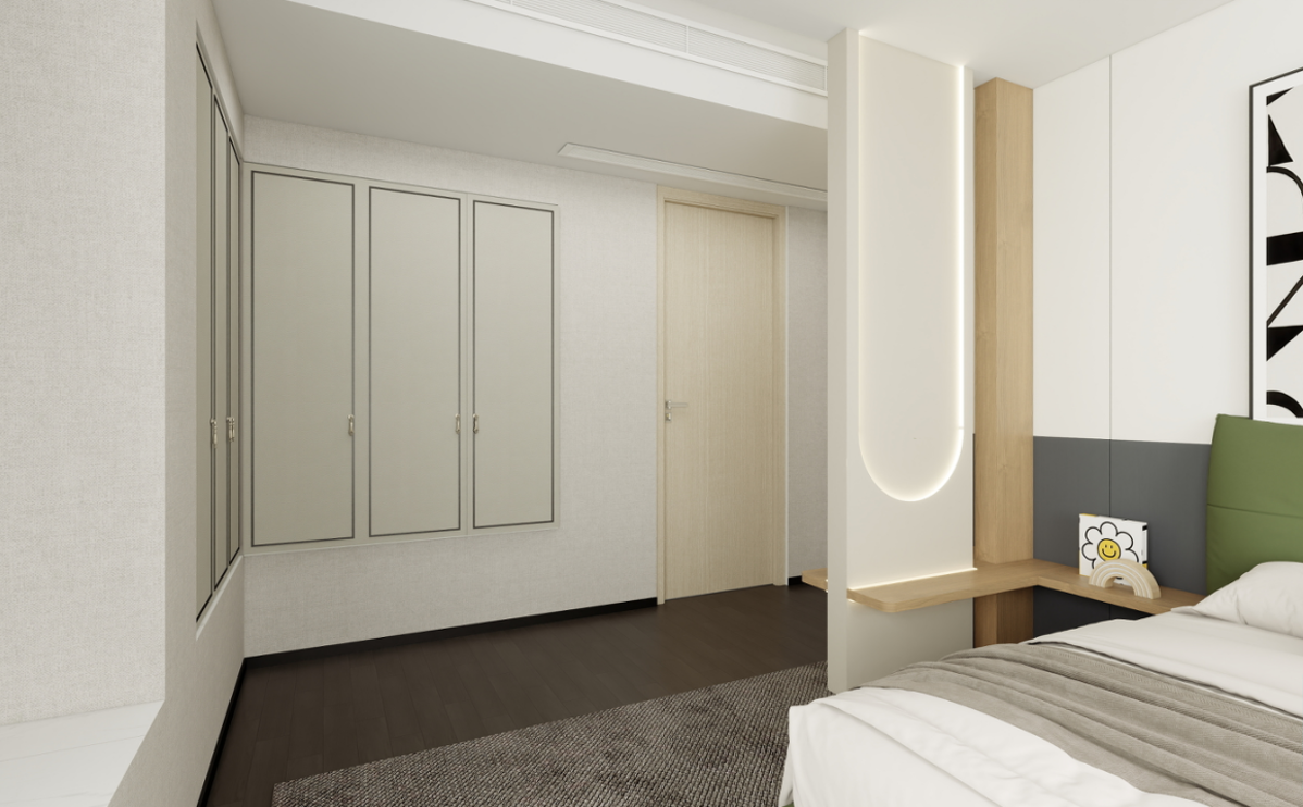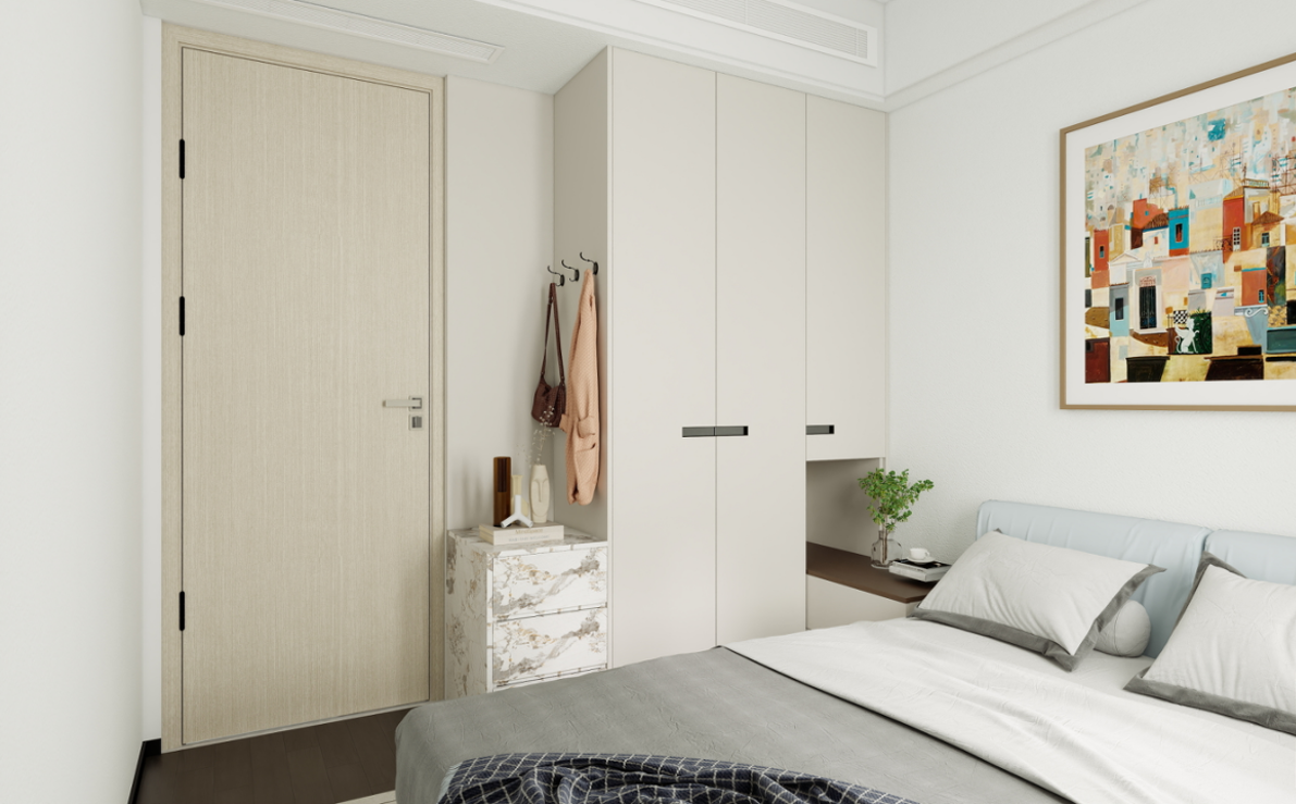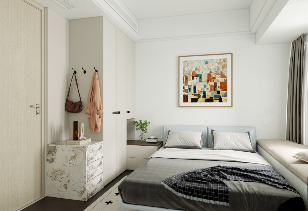 衣柜:定制的到頂衣柜提供了充足的儲(chǔ)物空間,淺灰色的柜門簡(jiǎn)潔大方,與房間整體風(fēng)格相契合。