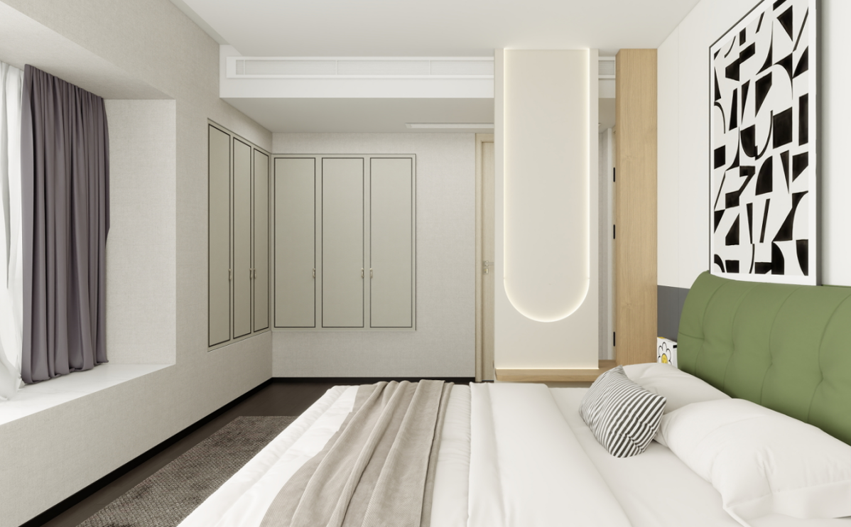 床品與色彩:白色的床品搭配淺灰色的窗簾,營造出寧靜、放松的睡眠環(huán)境。綠色的床頭板為空間增添了一抹亮色,提升了整體的活力。