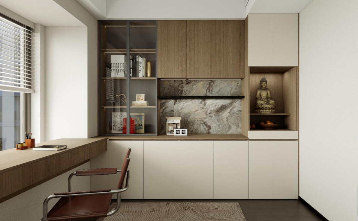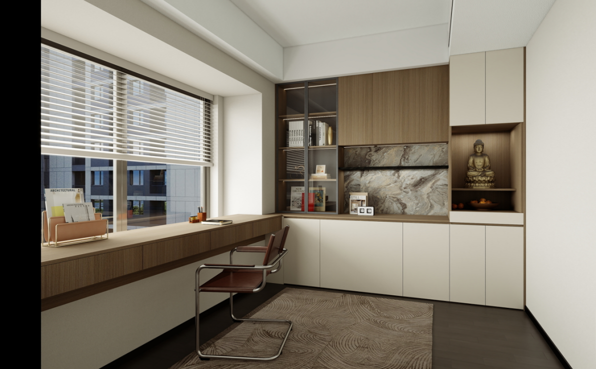 書桌與書架:靠窗定制的長書桌提供了充足的工作和學(xué)習(xí)空間,搭配舒適的椅子,適合長時(shí)間使用。書架采用開放式與封閉式相結(jié)合的設(shè)計(jì),方便存放和展示書籍、裝飾品等。