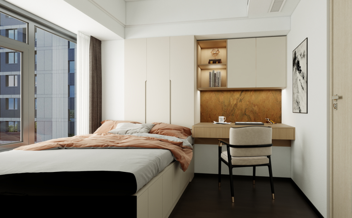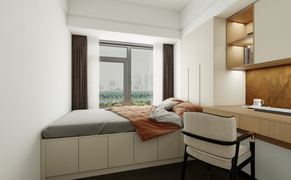 榻榻米與書桌:定制的榻榻米床兼具睡眠和儲(chǔ)物功能,床頭的書桌與衣柜相連,形成了一個(gè)高效的學(xué)習(xí)和儲(chǔ)物空間。