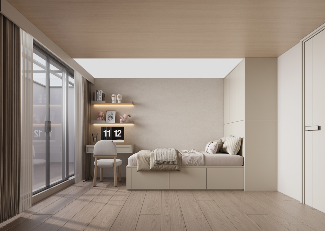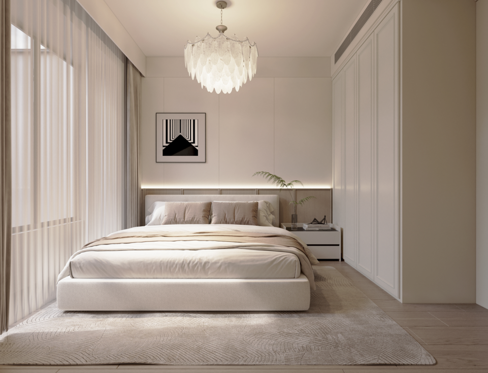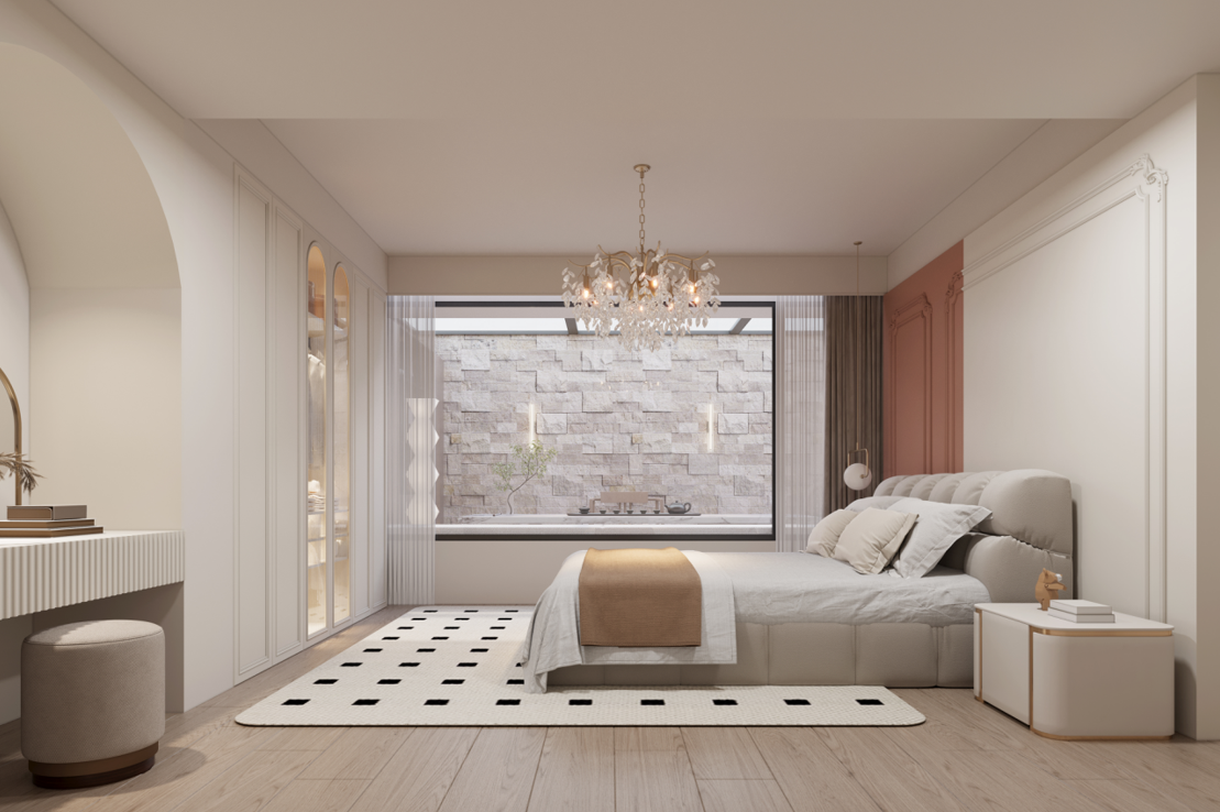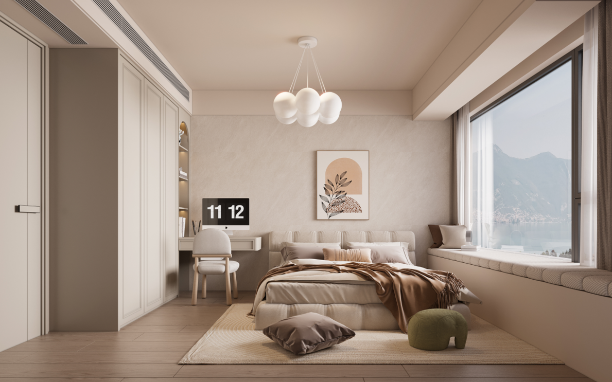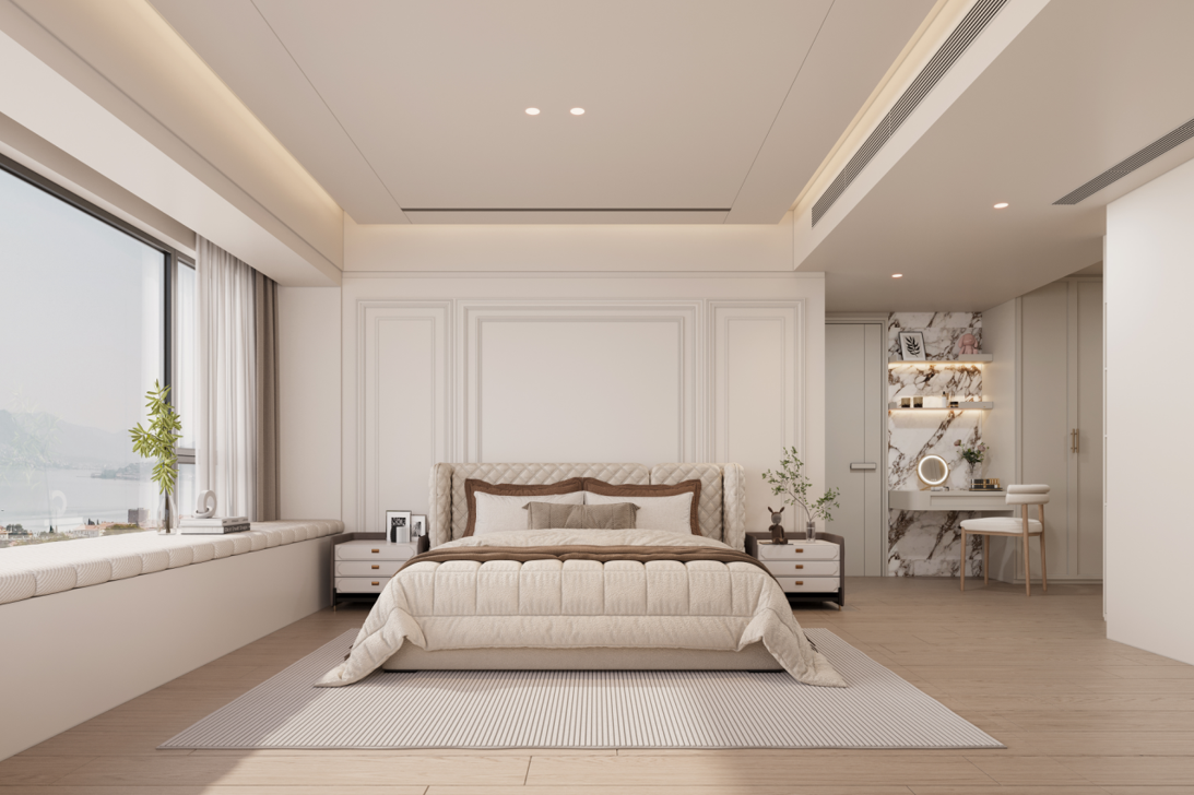 主臥:定制的護墻板和到頂衣柜,增強了空間的整體感和收納能力。梳妝臺與衣柜一體化設計,節(jié)省空間且使用方便。