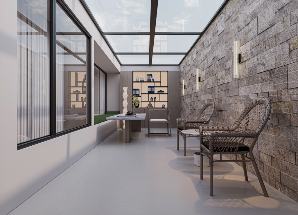 品茗區(qū):定制的書架和休閑桌椅,打造出一個安靜、愜意的品茶和閱讀空間。石材墻面和玻璃頂?shù)脑O計,增強了空間的自然感和通透感。