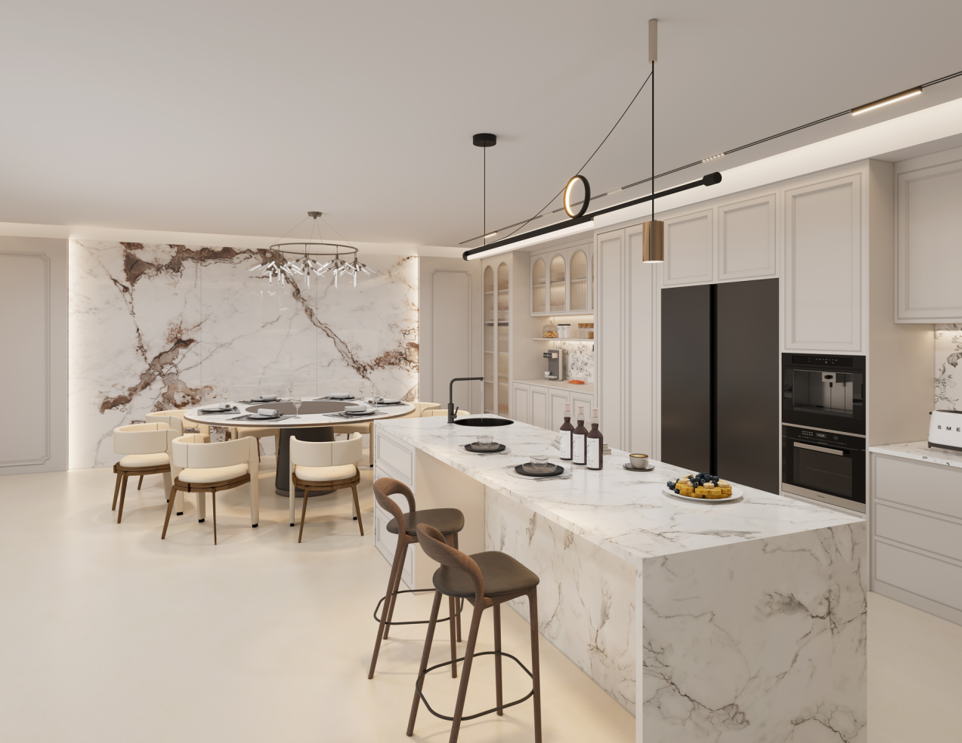 廚房:采用簡潔的白色櫥柜,搭配大理石紋理的臺面和背景墻,顯得干凈整潔且富有質感。整體櫥柜根據(jù)廚房的空間尺寸進行定制,充分利用了墻角和墻面空間,提供了充足的儲物空間。中島臺的設計不僅增加了操作空間,還可以作為早餐吧或社交區(qū)域,增強了廚房的功能性。