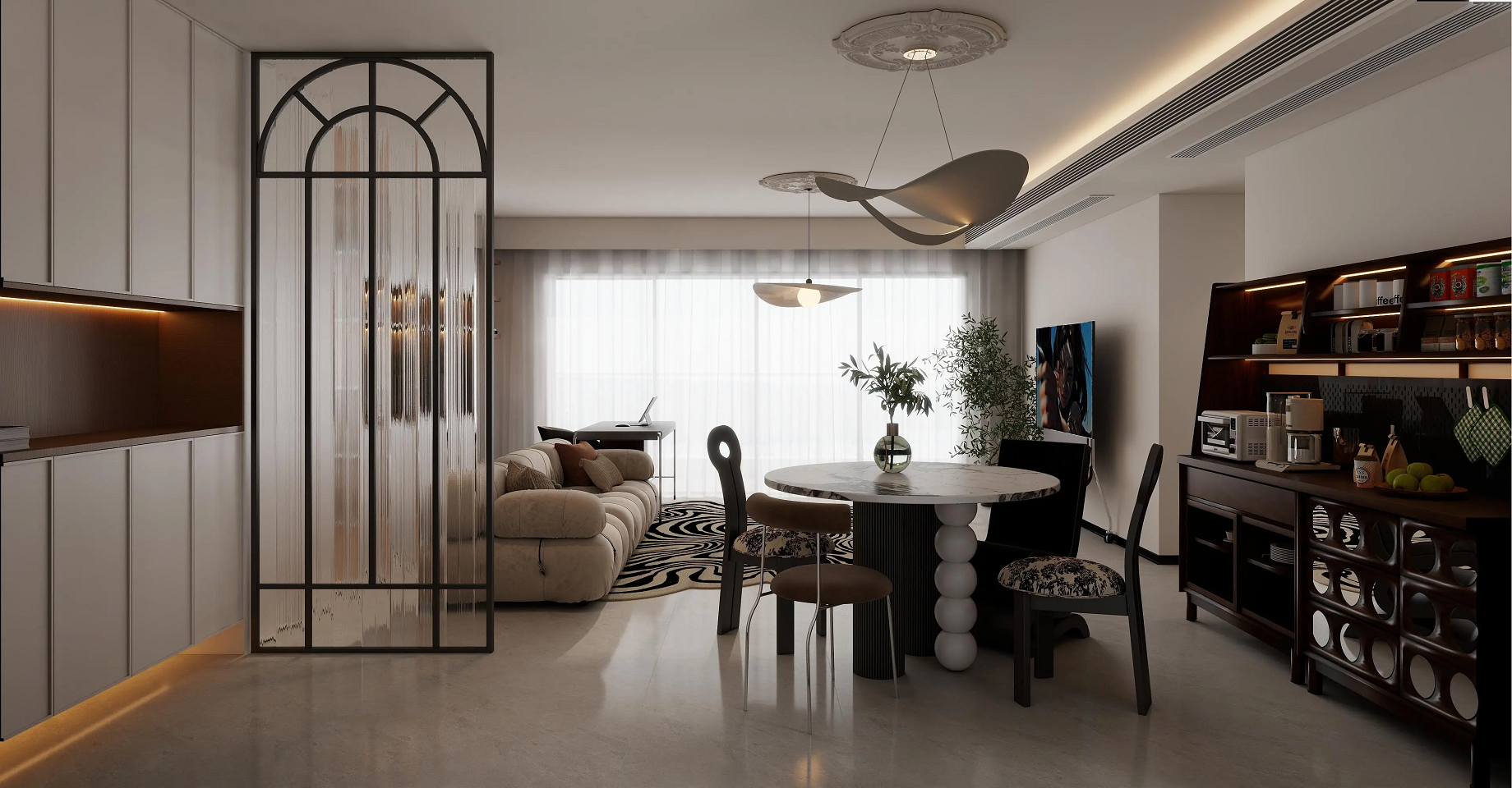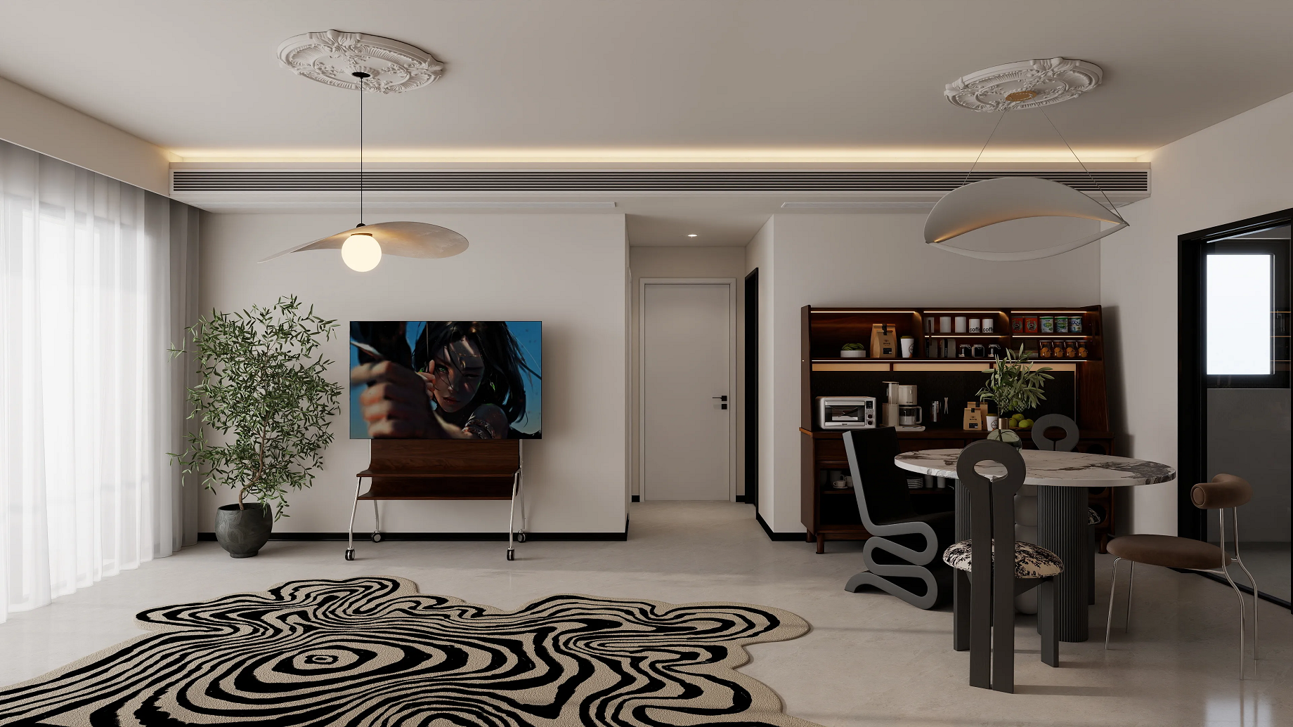 客客廳區(qū)域擺放了舒適的沙發(fā)和獨(dú)特的圓形大理石餐桌,搭配黑白相間的抽象地毯,增添了藝術(shù)感。電視背景墻簡(jiǎn)潔,電視下方的移動(dòng)支架和旁邊的綠植為空間增添了生機(jī)。吊燈設(shè)計(jì)獨(dú)特,既提供了充足的照明,又成為空間中的視覺焦點(diǎn)