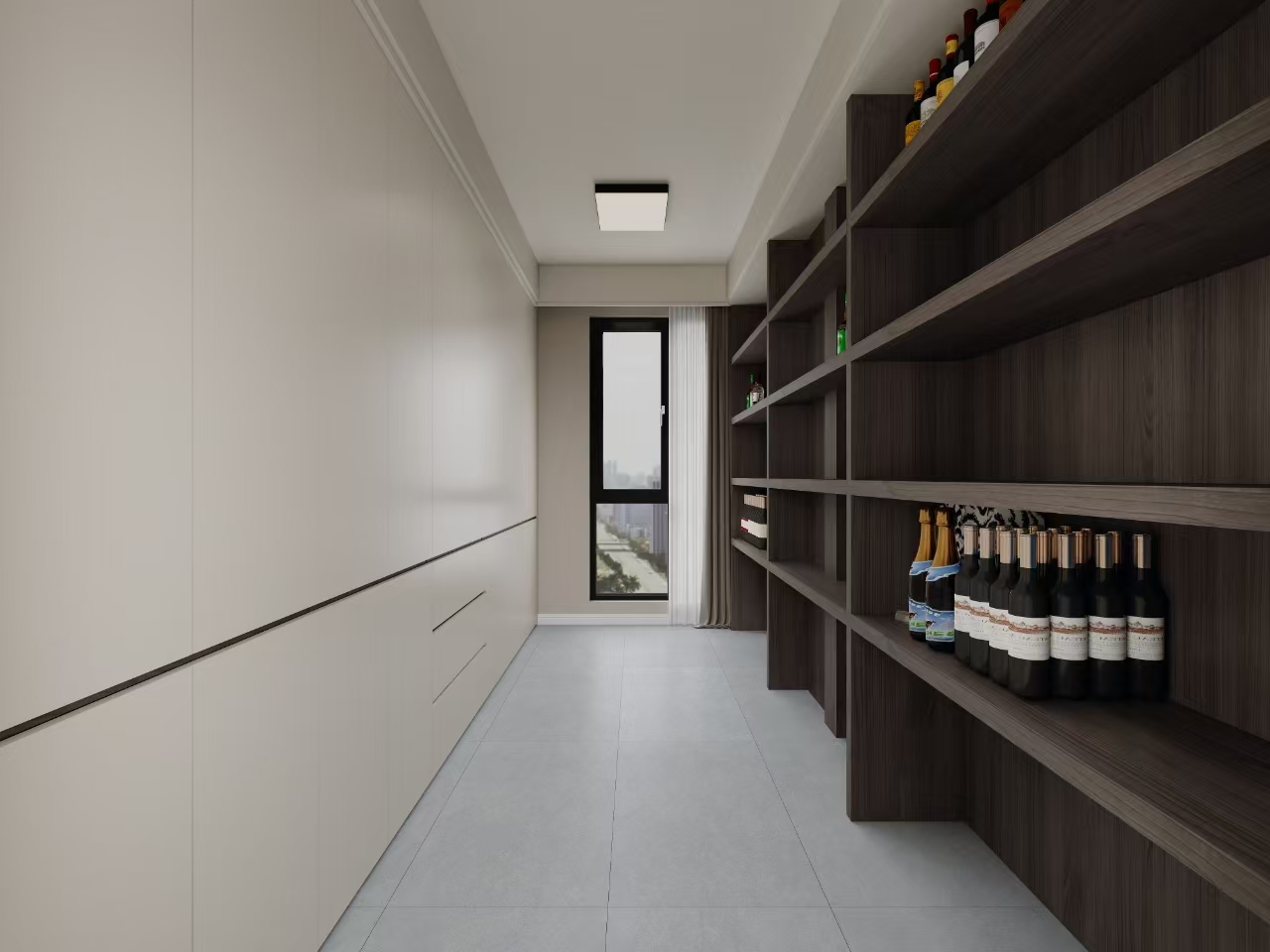 功能性設(shè)計(jì):狹長的空間被合理利用,一側(cè)是大型的儲物柜,另一側(cè)是開放式的酒架,滿足了不同的儲物需求。酒架上整齊擺放的酒瓶,既實(shí)用又具有一定的裝飾性。