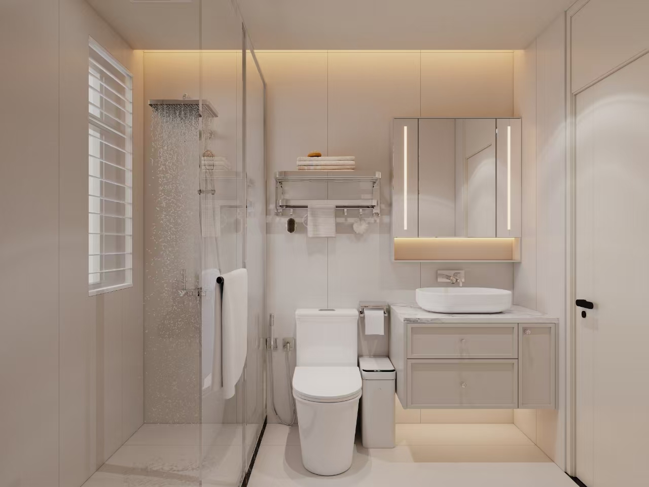 采用玻璃隔斷進(jìn)行干濕分區(qū),保持了衛(wèi)生間的干燥和清潔。簡潔的洗手臺、馬桶和淋浴設(shè)施,布局緊湊合理。鏡柜的設(shè)計(jì)增加了收納空間,同時內(nèi)置燈光方便使用。墻面的瓷磚選擇和整體色調(diào)搭配,使衛(wèi)生間顯得干凈整潔。
