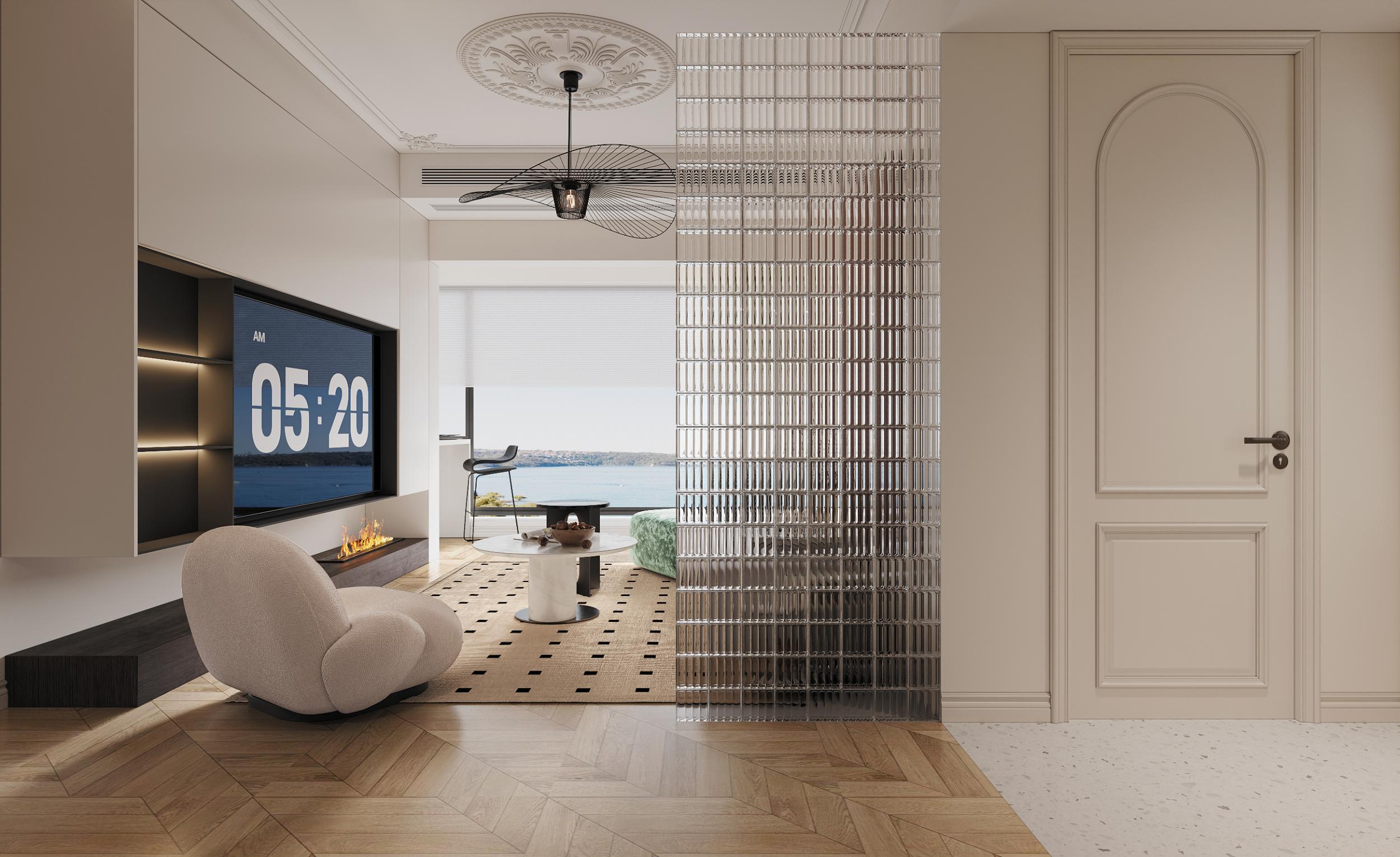 客廳設(shè)計(jì)了透明玻璃的隔斷設(shè)計(jì),這種隔斷屬于半墻式隔斷的一種特殊形式。它不完全封閉空間,在劃分功能區(qū)域的同時(shí),保持了空間的通透感和連貫性,避免了傳統(tǒng)實(shí)體墻隔斷可能帶來(lái)的壓抑感。