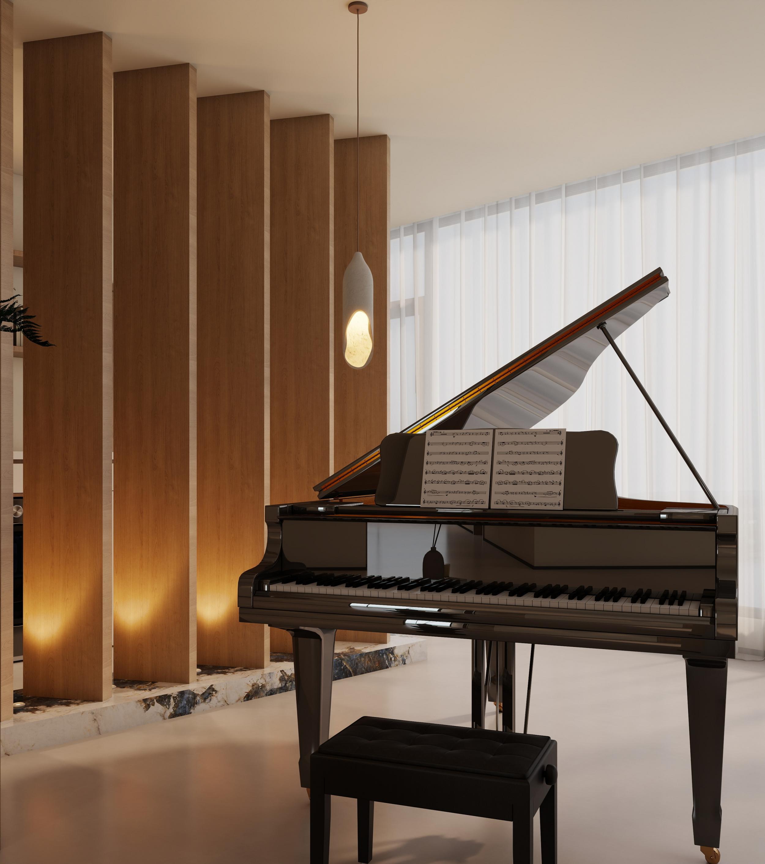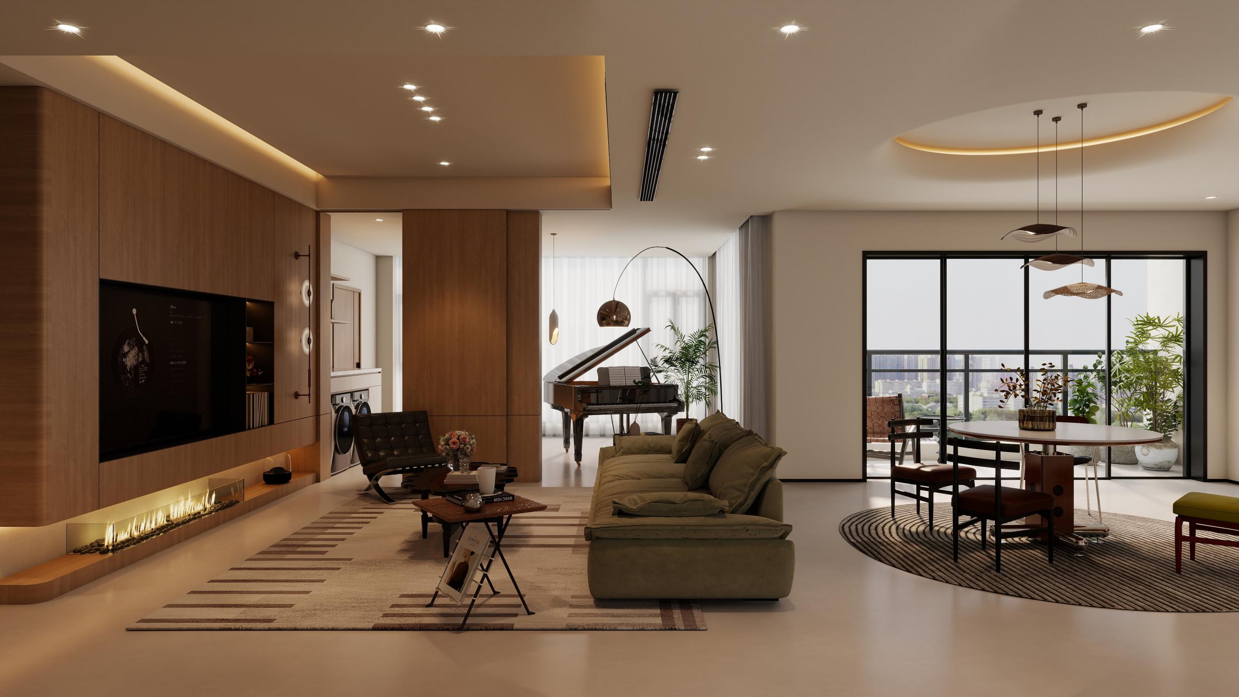 以木質材料為主打造電視背景墻和隔斷,帶來自然溫暖的感覺。深綠色的沙發(fā)成為空間中的一抹亮色,與木質的暖調形成對比又和諧統(tǒng)一?;⌒温涞責舨粌H提供局部照明,還增添了空間的柔和感與藝術氛圍。巴塞羅那椅等單品的選擇,提升了空間的時尚感和舒適度。