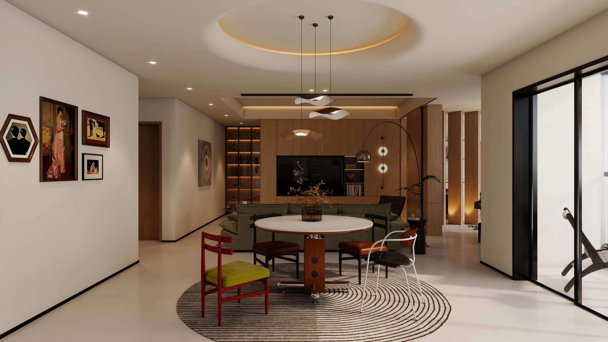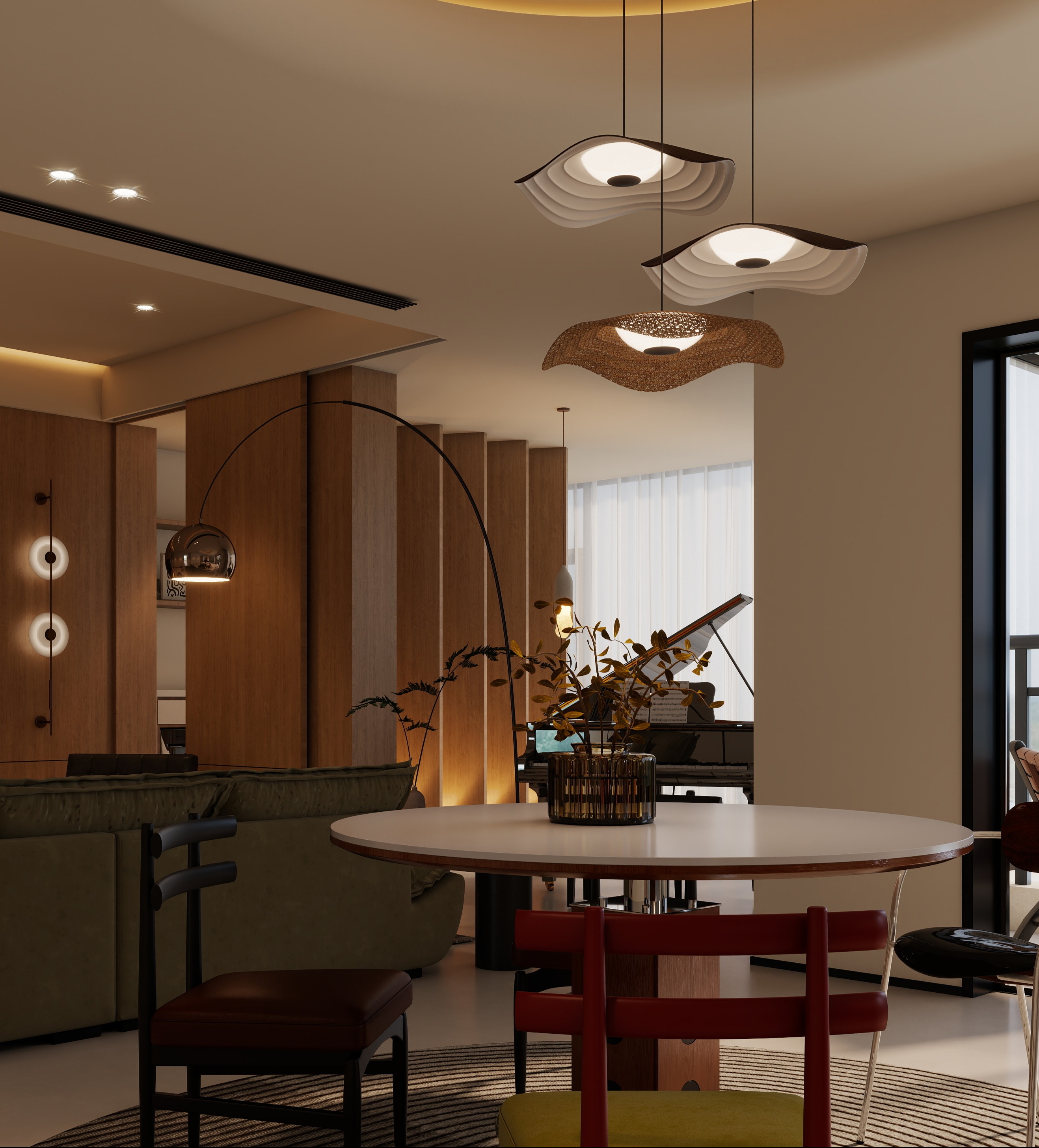 獨特的波浪形吊燈成為餐廳的視覺焦點,造型別致,光線柔和,營造出溫馨的用餐氛圍。圓形白色餐桌簡潔大方,搭配紅色和黑色等不同色彩的椅子,增加了空間的活潑感。桌上擺放的植物裝飾,為空間帶來生機。