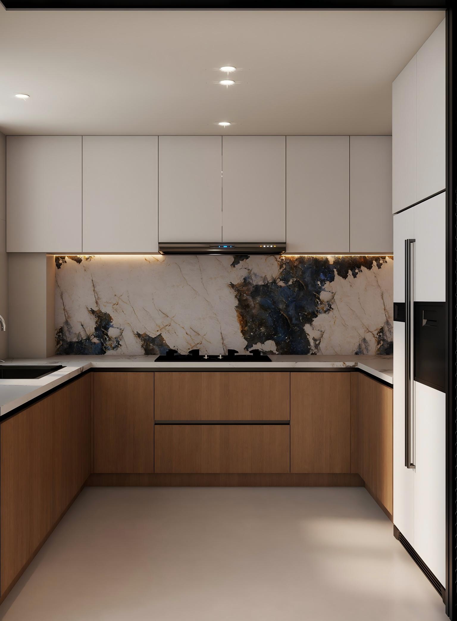 采用白色與木色的經典搭配,簡潔明亮。大理石紋理的背景墻提升了廚房的質感和時尚感。整體布局緊湊合理,櫥柜提供了充足的儲物空間,滿足廚房收納需求。