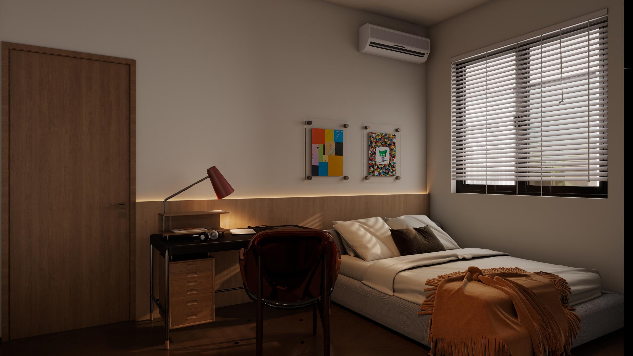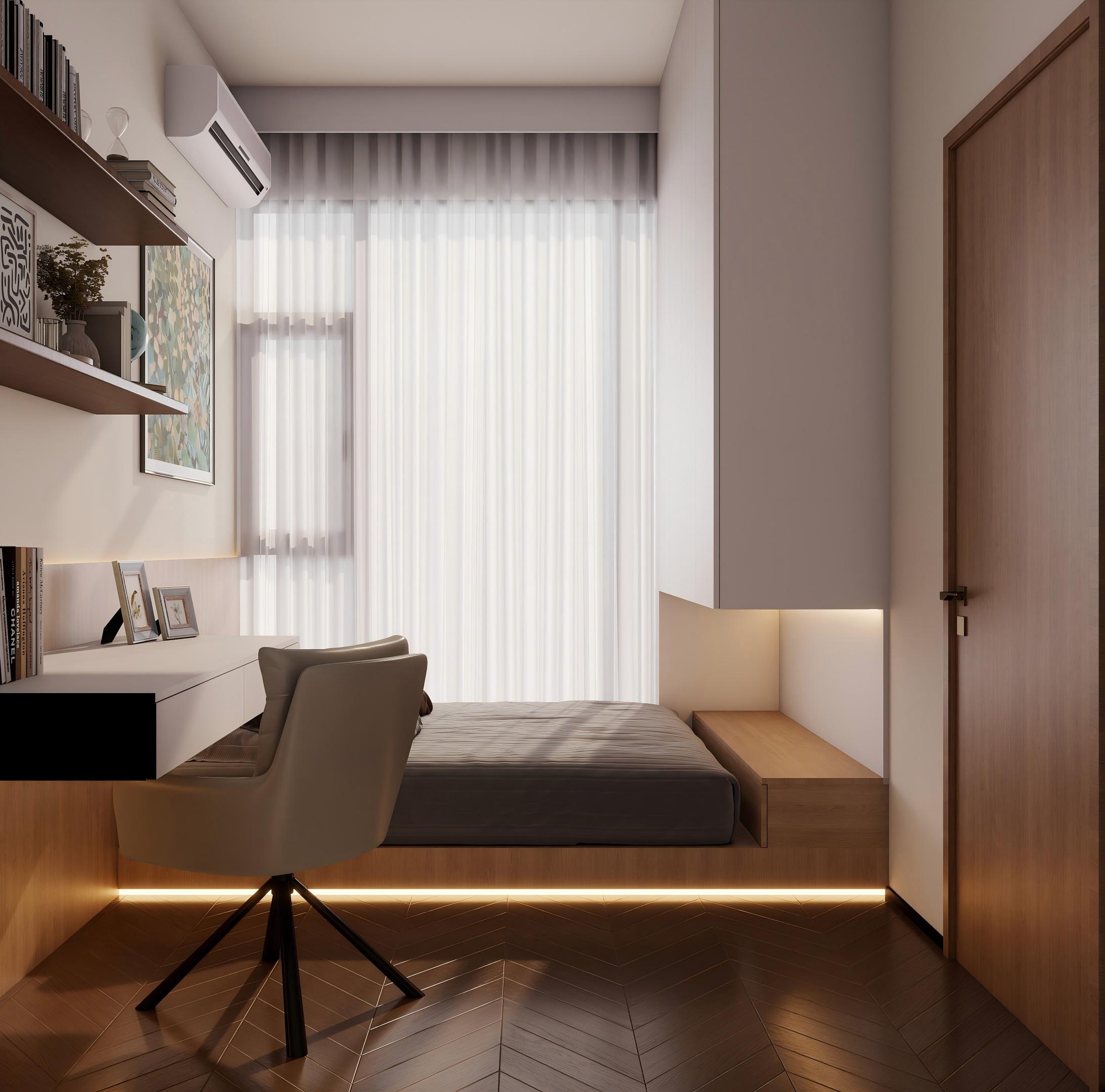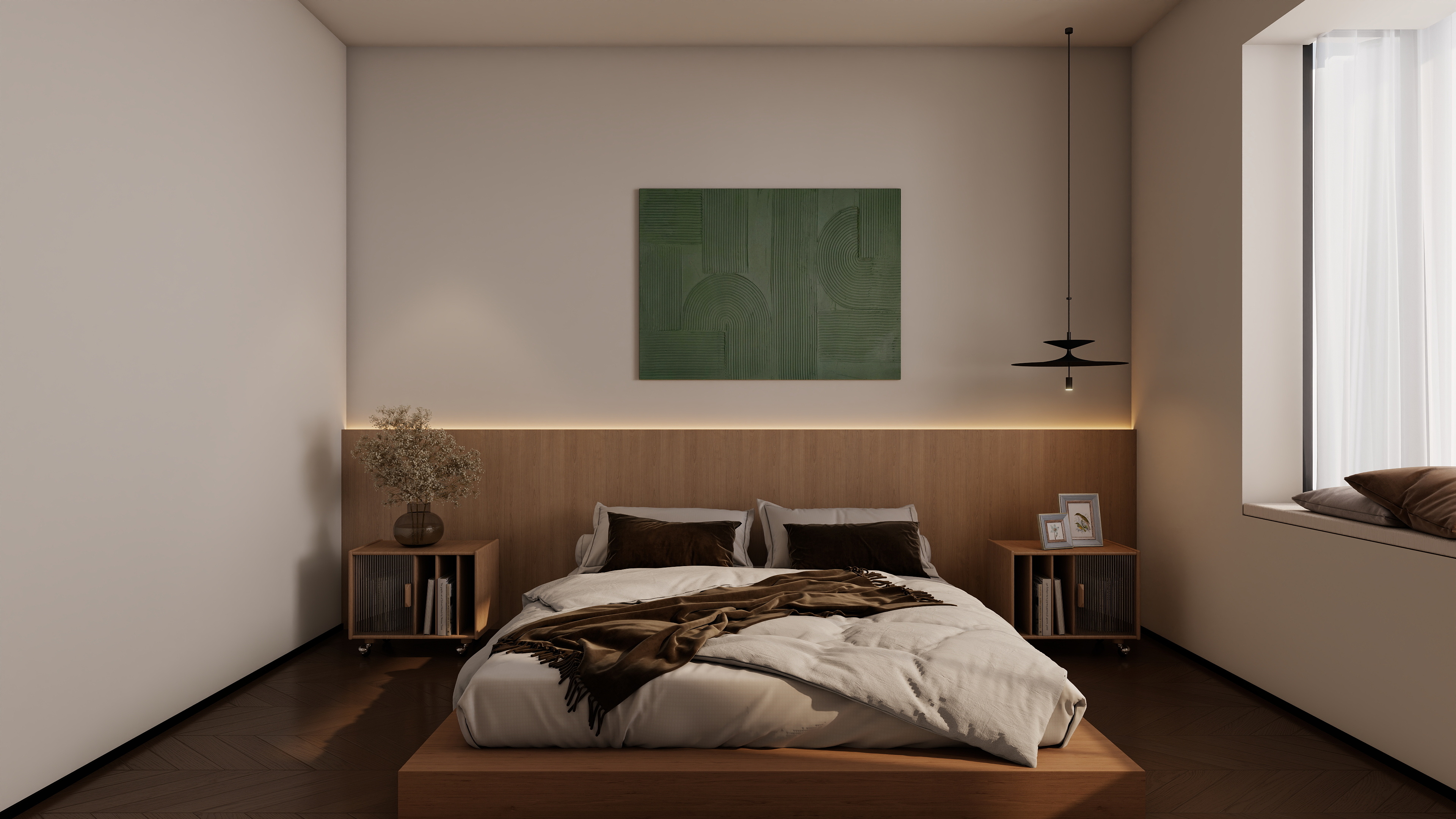 整體色調柔和,以米色、木色為主,營造出寧靜、舒適的睡眠環(huán)境。床頭的藝術畫和吊燈,增添了空間的藝術感和溫馨感。部分臥室設計了書桌區(qū)域,滿足工作或學習的需求,同時利用墻面空間設置擱架,增加收納和展示功能。