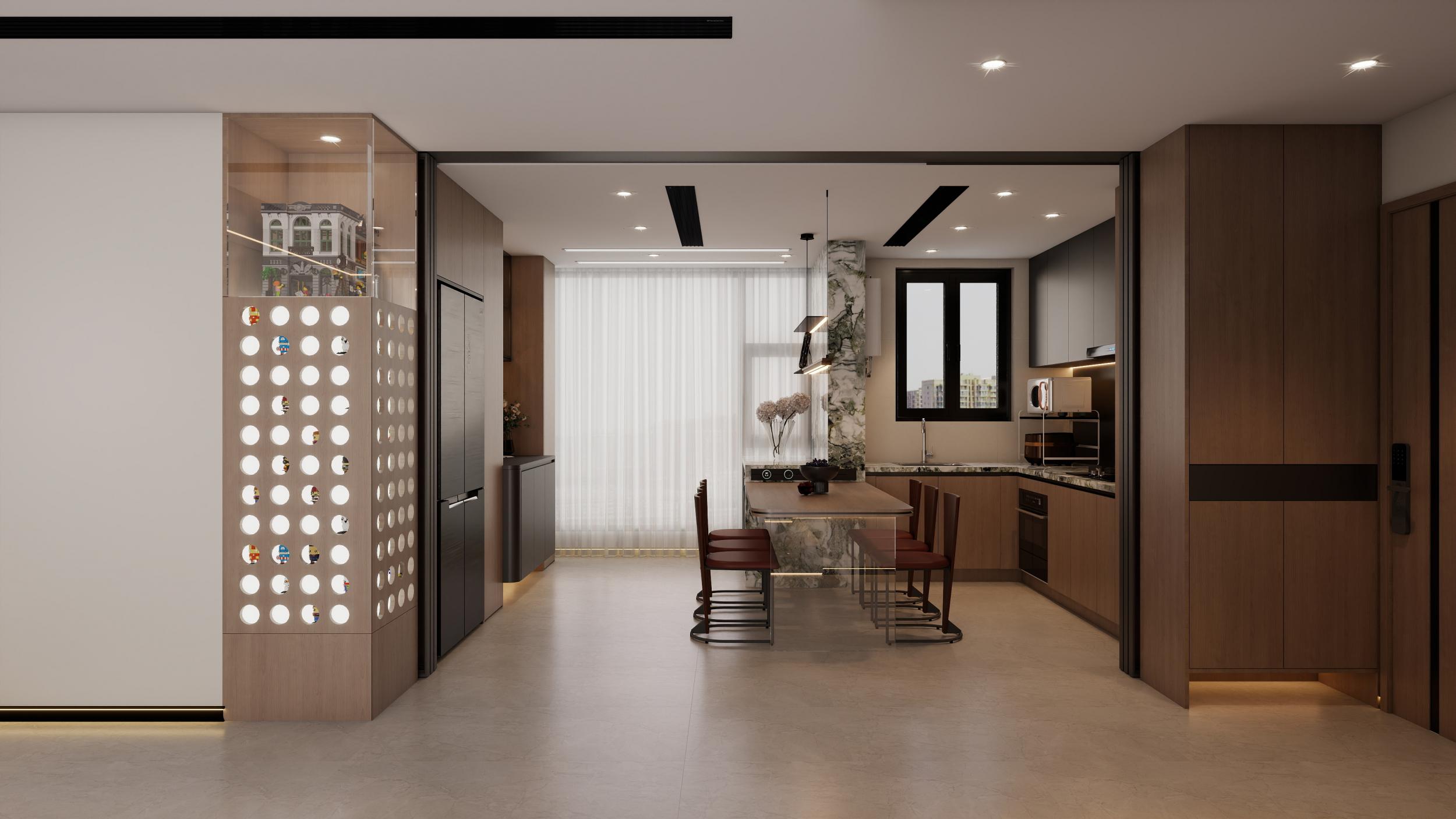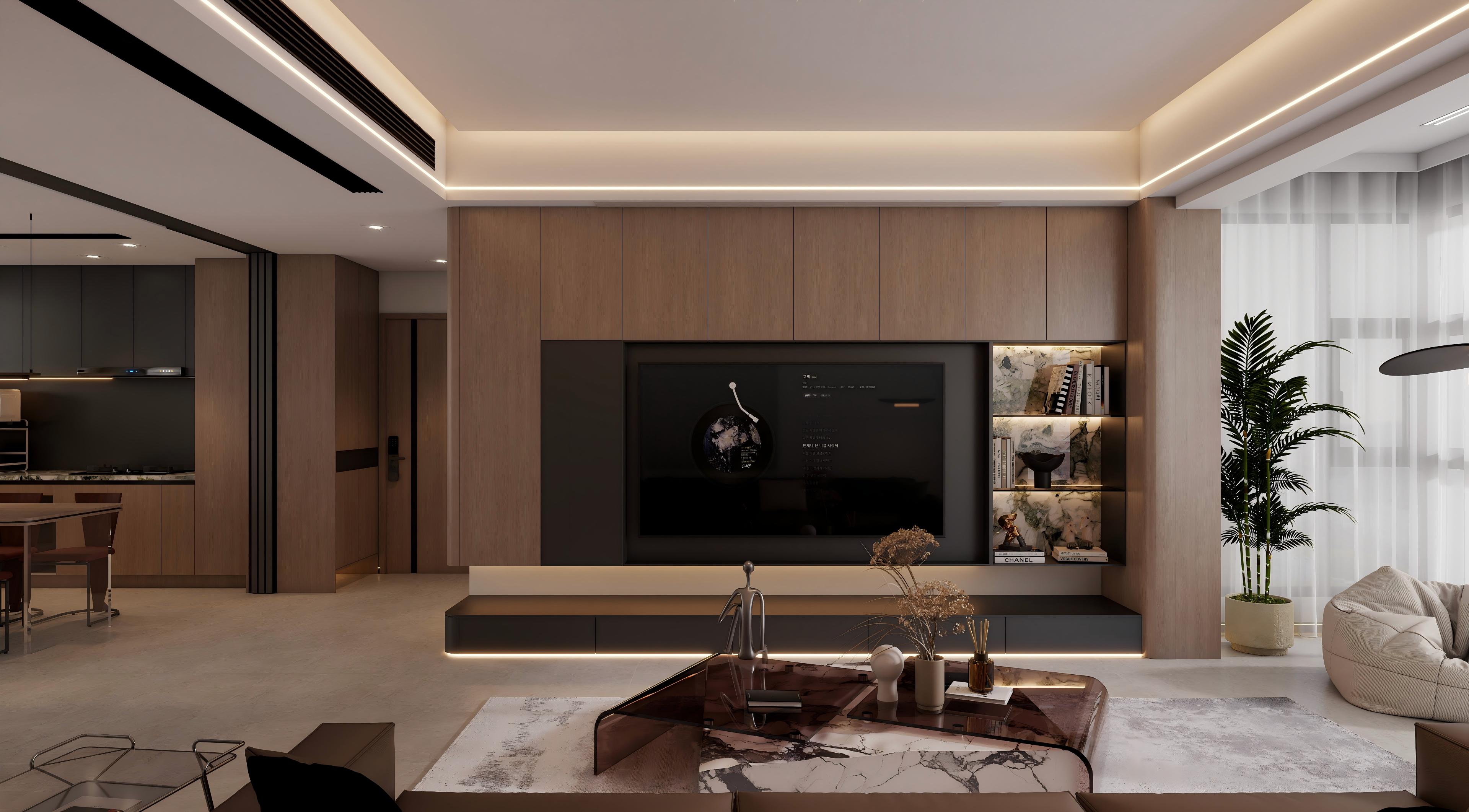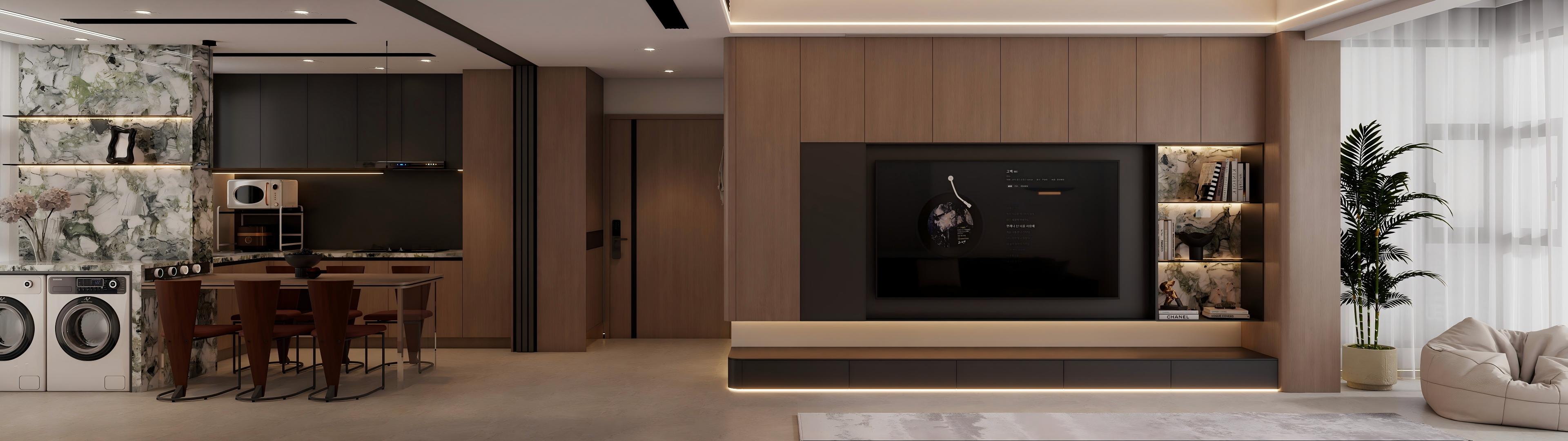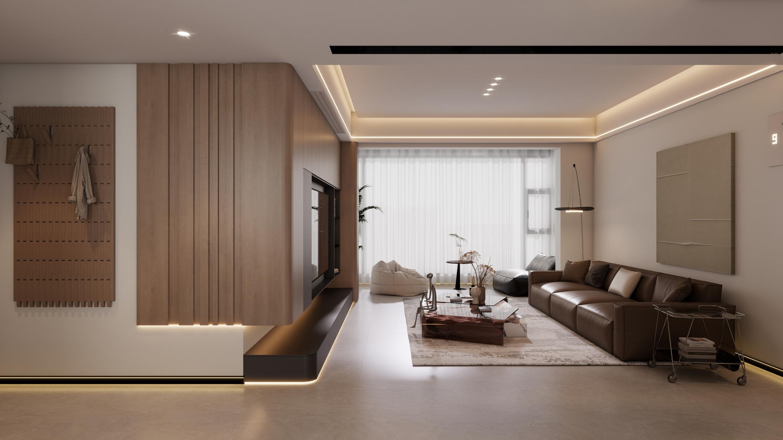 客廳以淺色系為主調(diào),搭配木質(zhì)元素和大理石材質(zhì),營造出明亮、寬敞且溫馨的氛圍。墻面和天花板采用簡潔的白色,地面則鋪設(shè)淺色大理石瓷磚,增強了空間的通透感。