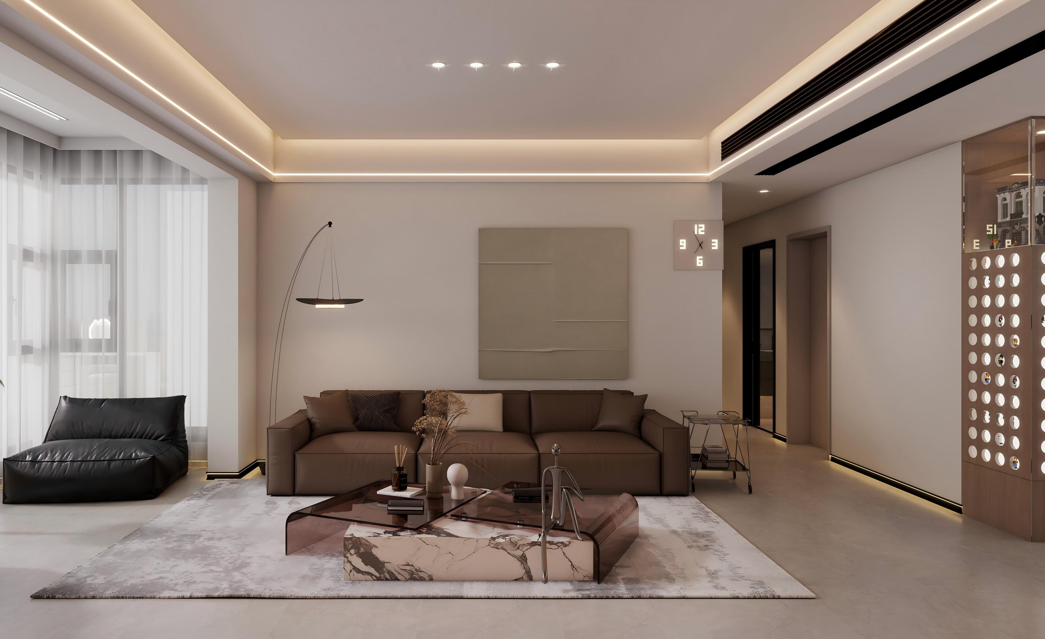 天花板采用無主燈設(shè)計,通過嵌入式筒燈和燈帶提供柔和而充足的光線。落地燈作為輔助光源,為閱讀或休閑時提供了局部照明。