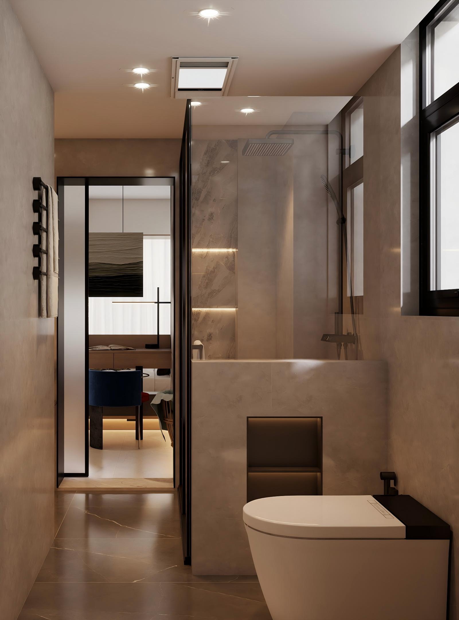 天花板安裝嵌入式筒燈和排氣扇,確保了良好的照明和通風效果。淋浴區(qū)的花灑和龍頭選用簡約造型,與衛(wèi)生間的整體風格相協(xié)調(diào)。