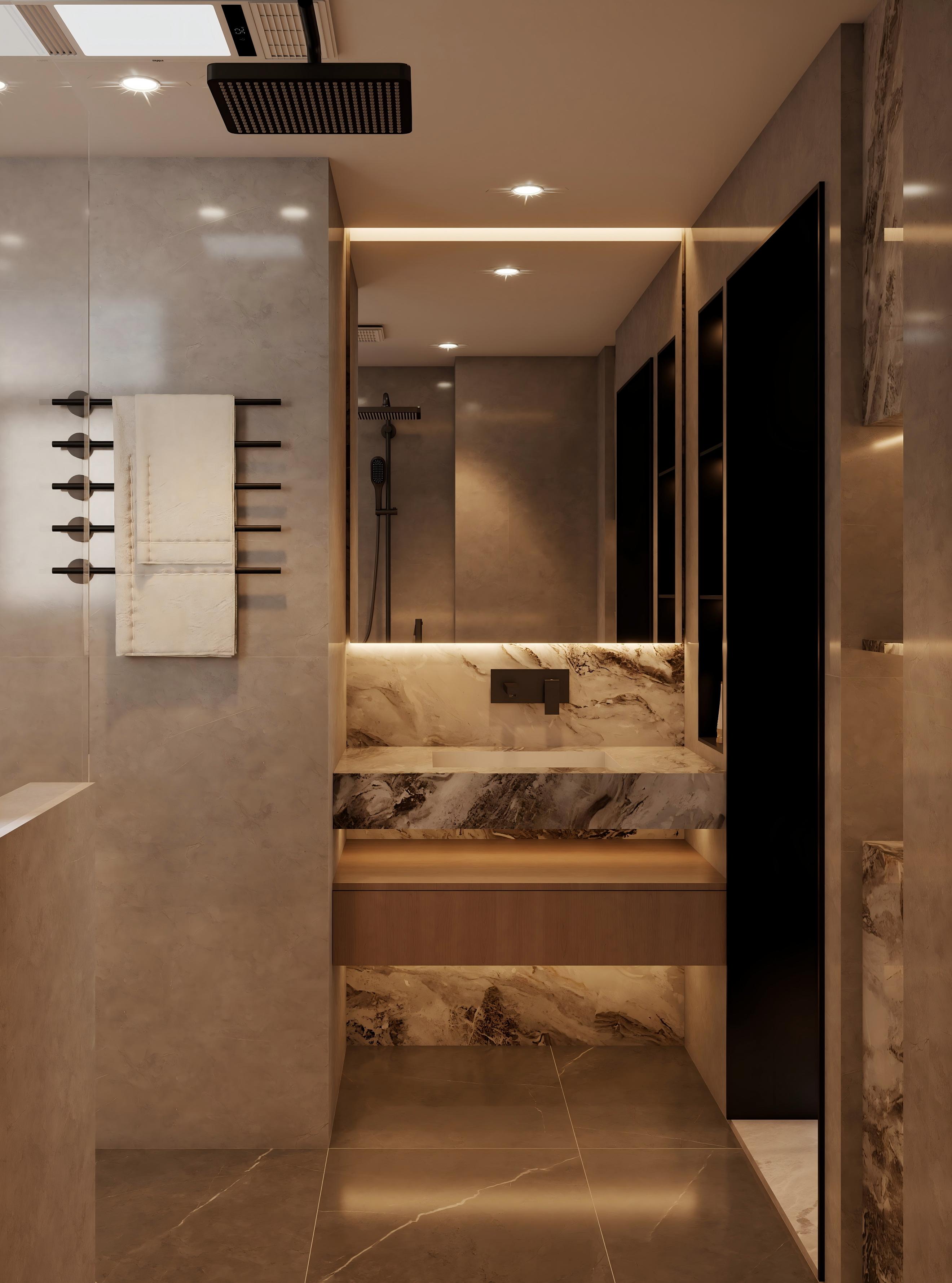 墻面和地面選用灰色大理石瓷磚,既耐臟又易于清潔。浴室柜和鏡柜的選用,提供了充足的收納空間,同時保持了整體風格的統(tǒng)一。