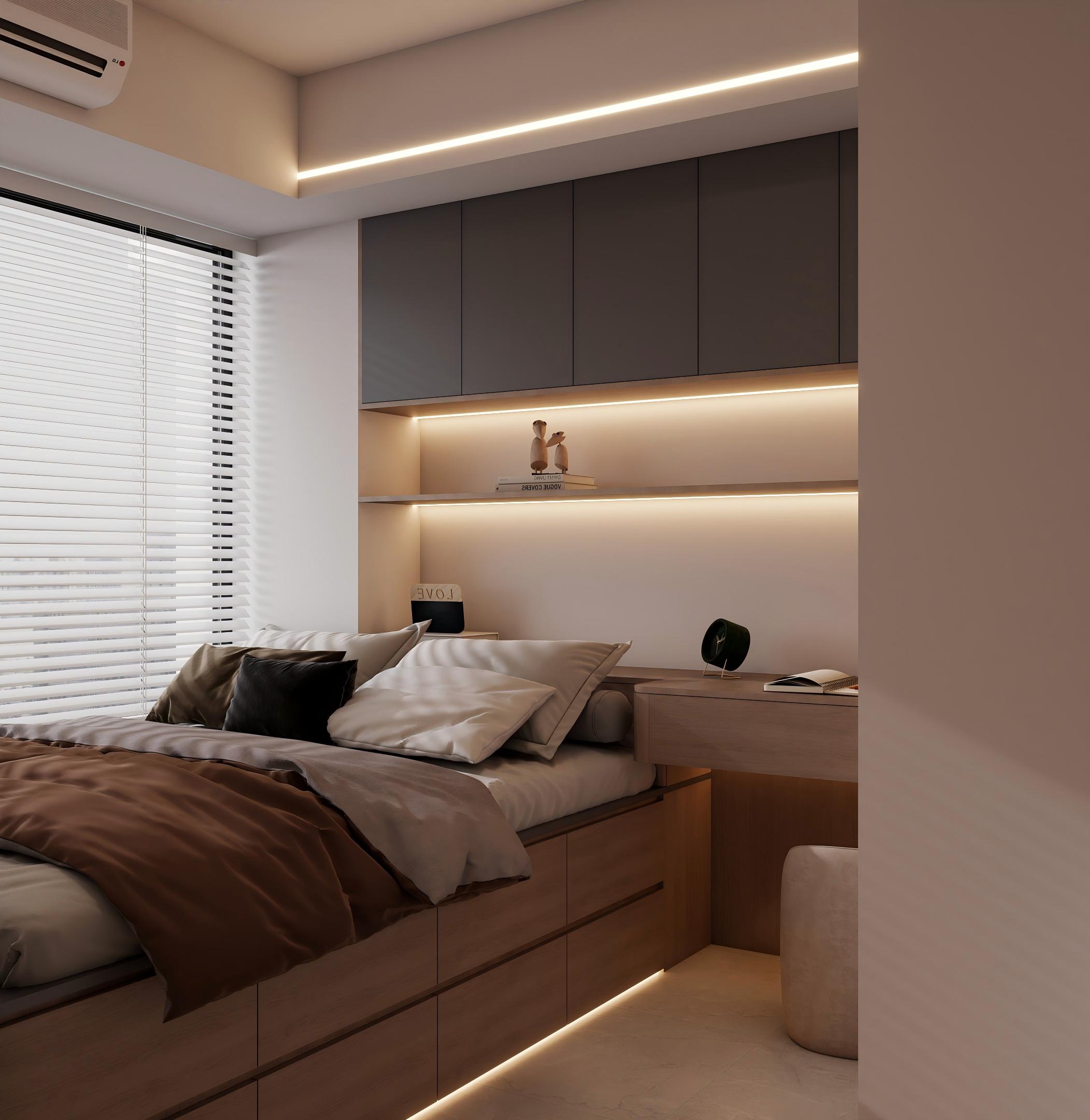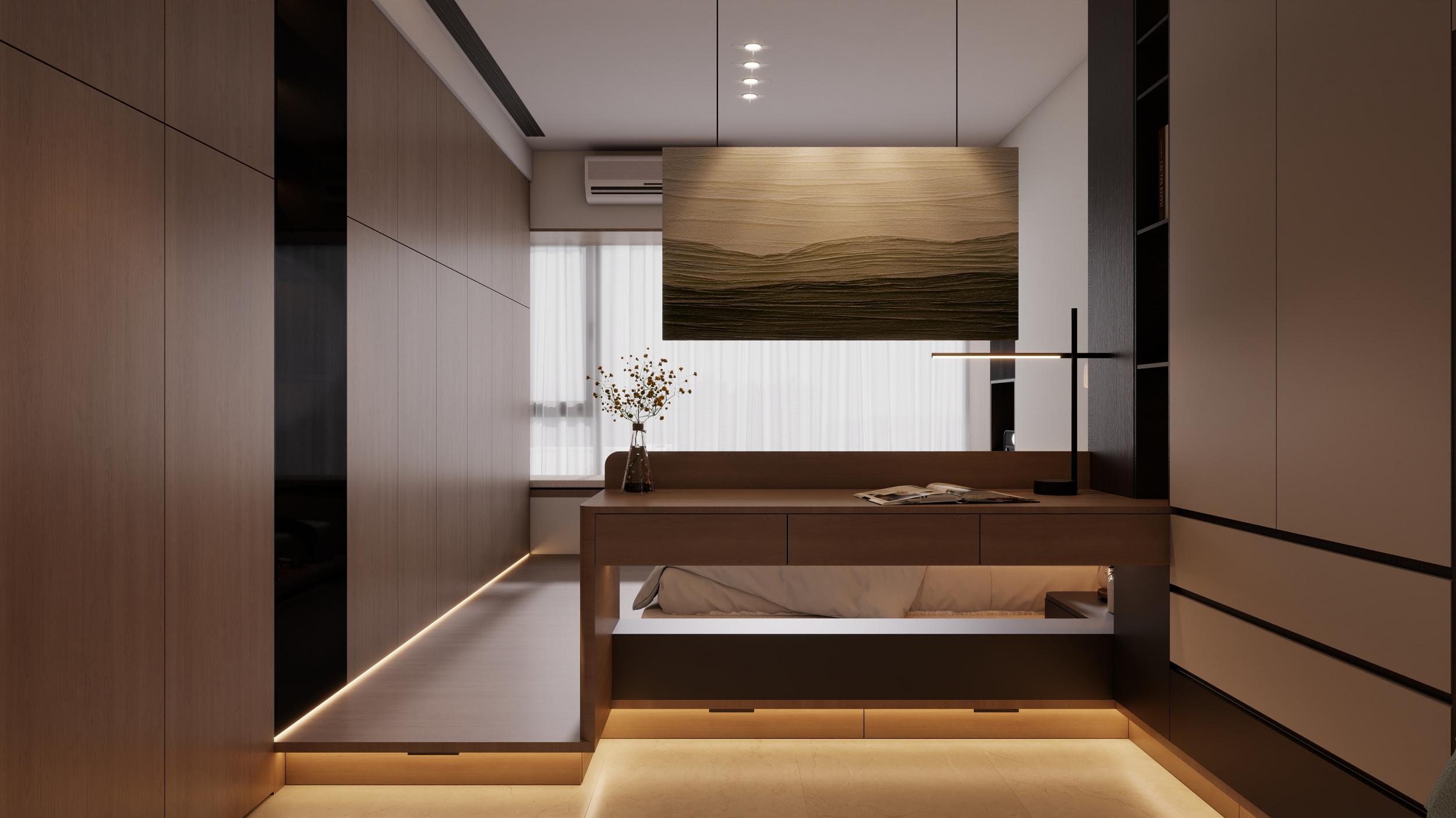 床作為臥室的核心家具,選用舒適材質(zhì)和合理尺寸,確保良好的睡眠體驗。衣柜和書桌的設(shè)計緊湊實用,滿足了收納和工作需求。飄窗的設(shè)計則提供了額外的休閑空間。