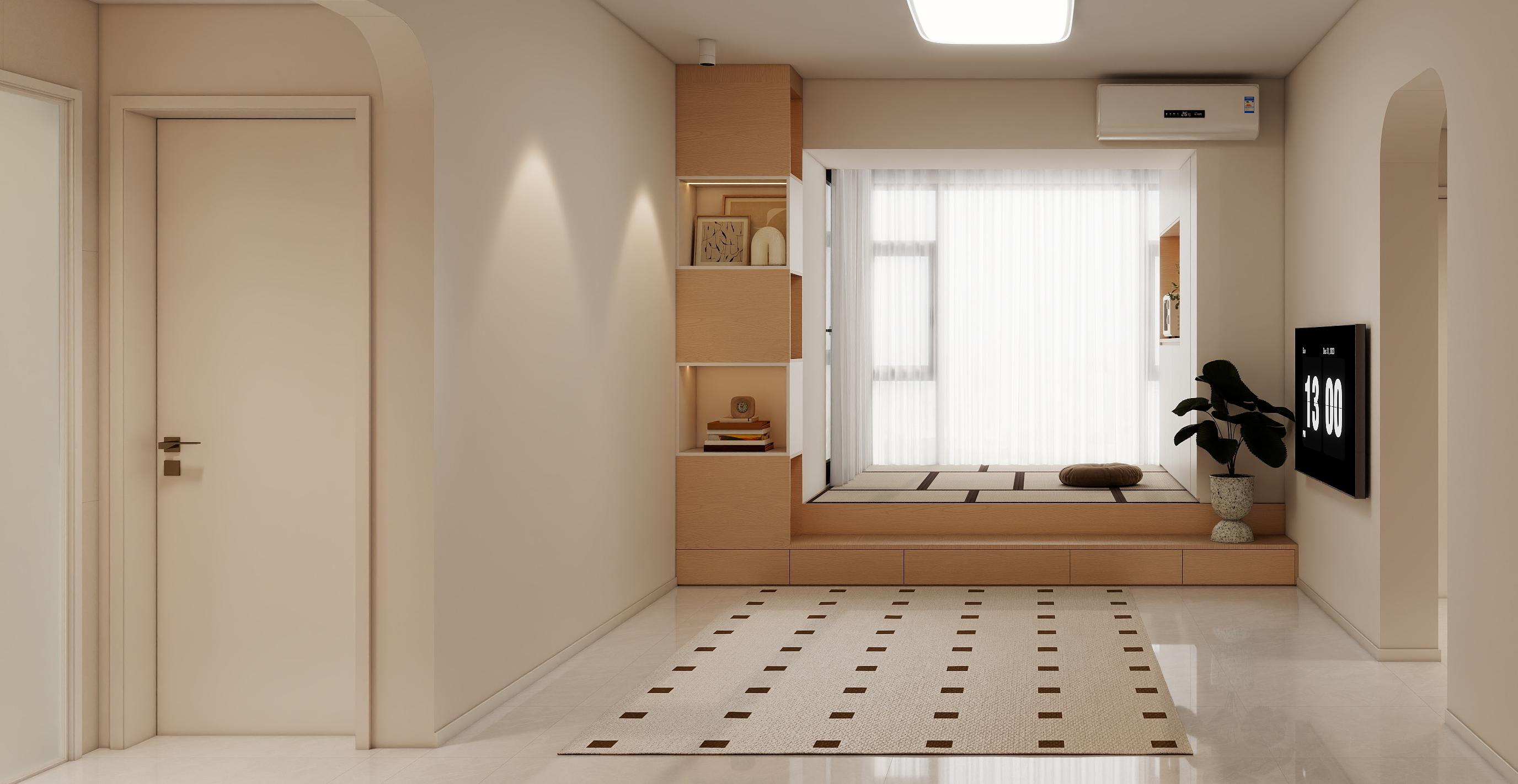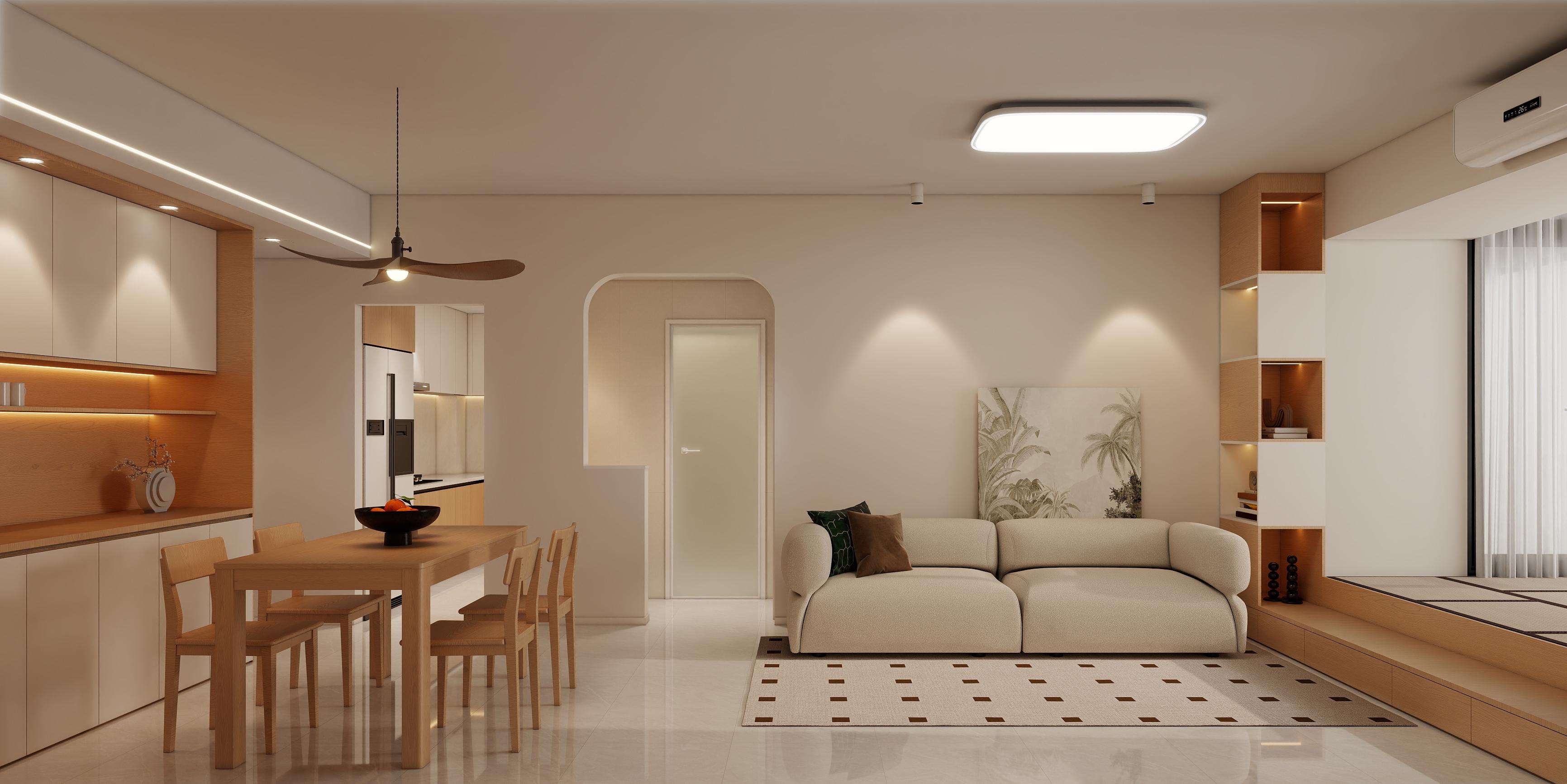客廳:采用LDK一體化設(shè)計(jì),客廳、餐廳、廚房聯(lián)動(dòng),打破空間隔閡,增強(qiáng)采光與互動(dòng)性。淺色瓷磚通鋪地面,反射光線使空間更顯寬敞。米色布藝沙發(fā)搭配木質(zhì)茶幾,柔和的曲線與自然材質(zhì)營(yíng)造溫暖氛圍;吊扇燈兼具實(shí)用性與復(fù)古情調(diào)。無(wú)主燈布局,提供均勻照明,重點(diǎn)區(qū)域如書架、裝飾畫,通過(guò)局部燈光突出層次感。電視墻整合開放式書架與封閉儲(chǔ)物柜,兼顧展示與收納需求;裝飾畫與綠植點(diǎn)綴空間,增添生活氣息。