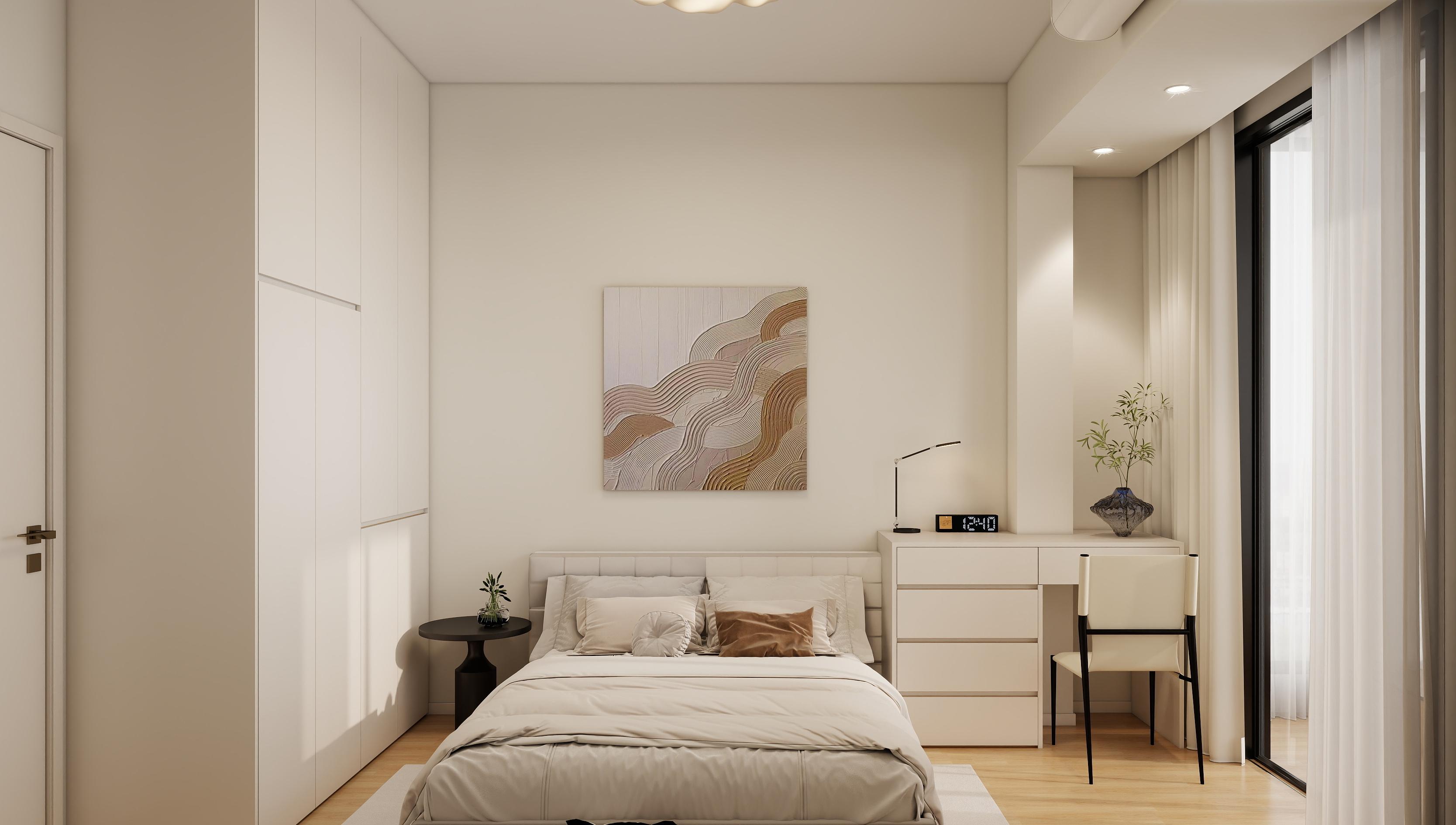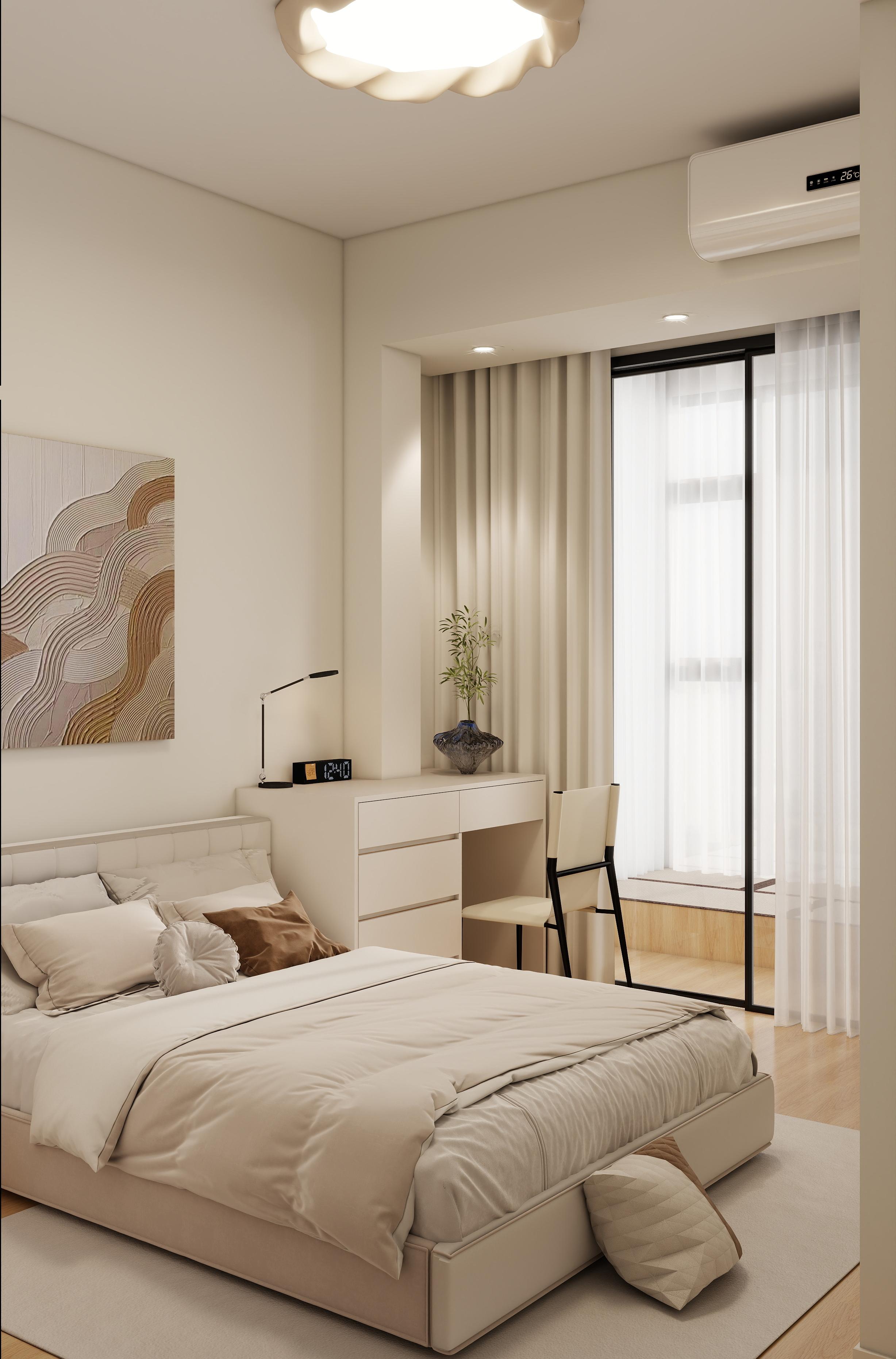 臥室:米白、淺木色為主,搭配啞光質(zhì)感的床品與家具,營(yíng)造寧?kù)o氛圍。床頭抽象裝飾畫與簡(jiǎn)約吊燈提升藝術(shù)感。定制通頂衣柜滿足衣物收納,床頭一側(cè)設(shè)置梳妝臺(tái)/書桌,結(jié)合飄窗區(qū)域優(yōu)化空間利用率。淺色紗簾過(guò)濾強(qiáng)光,保證隱私的同時(shí)保持通透感。