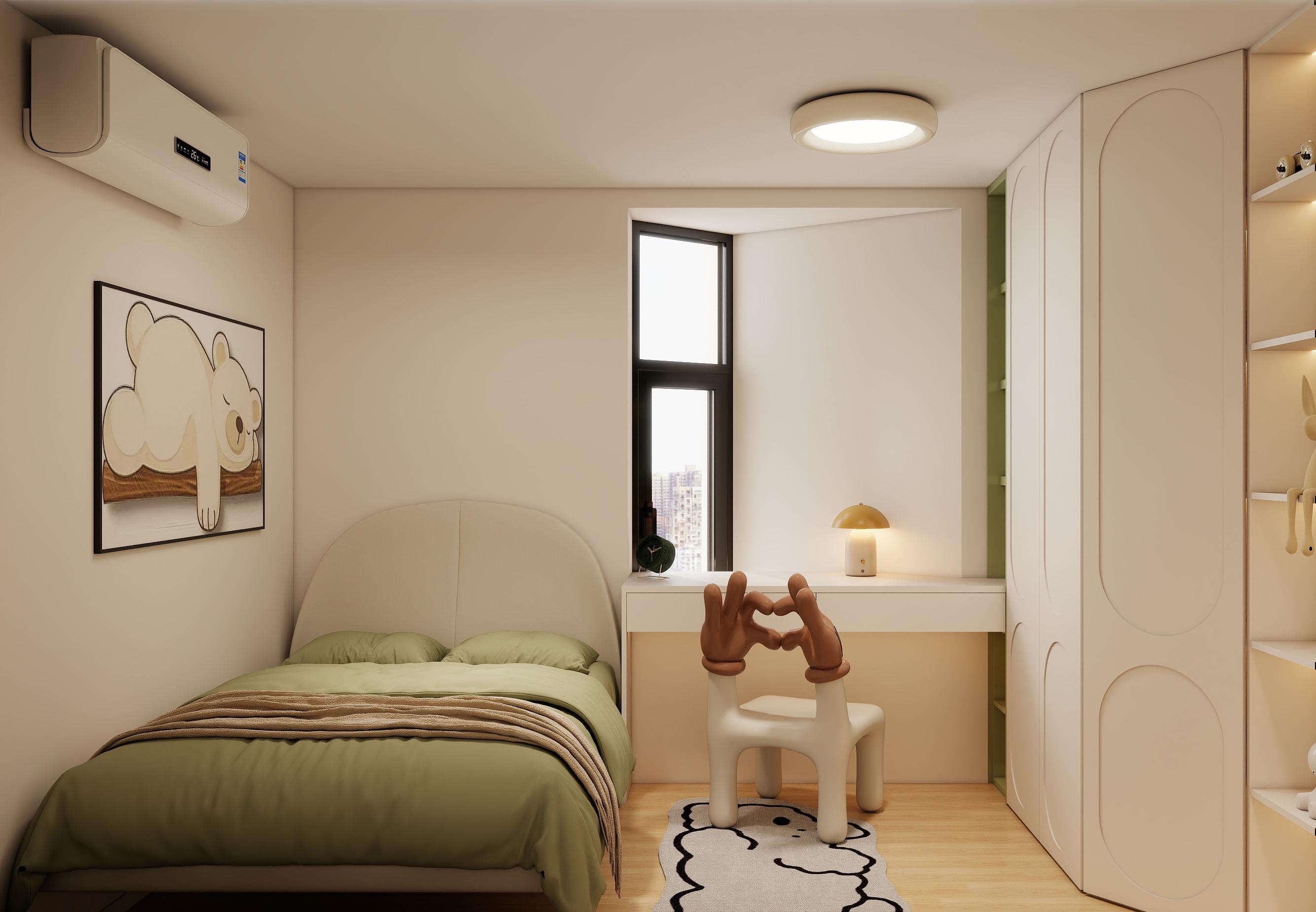兒童房:以柔和的米綠基調(diào)為主,搭配卡通元素,打造童趣氛圍。定制書桌靠窗布置,充分利用自然光線;趣味造型家具,激發(fā)孩子想象力。衣柜內(nèi)部設(shè)計(jì)開放式擱架與洞洞板,方便收納玩具與書籍,適應(yīng)成長(zhǎng)需求。