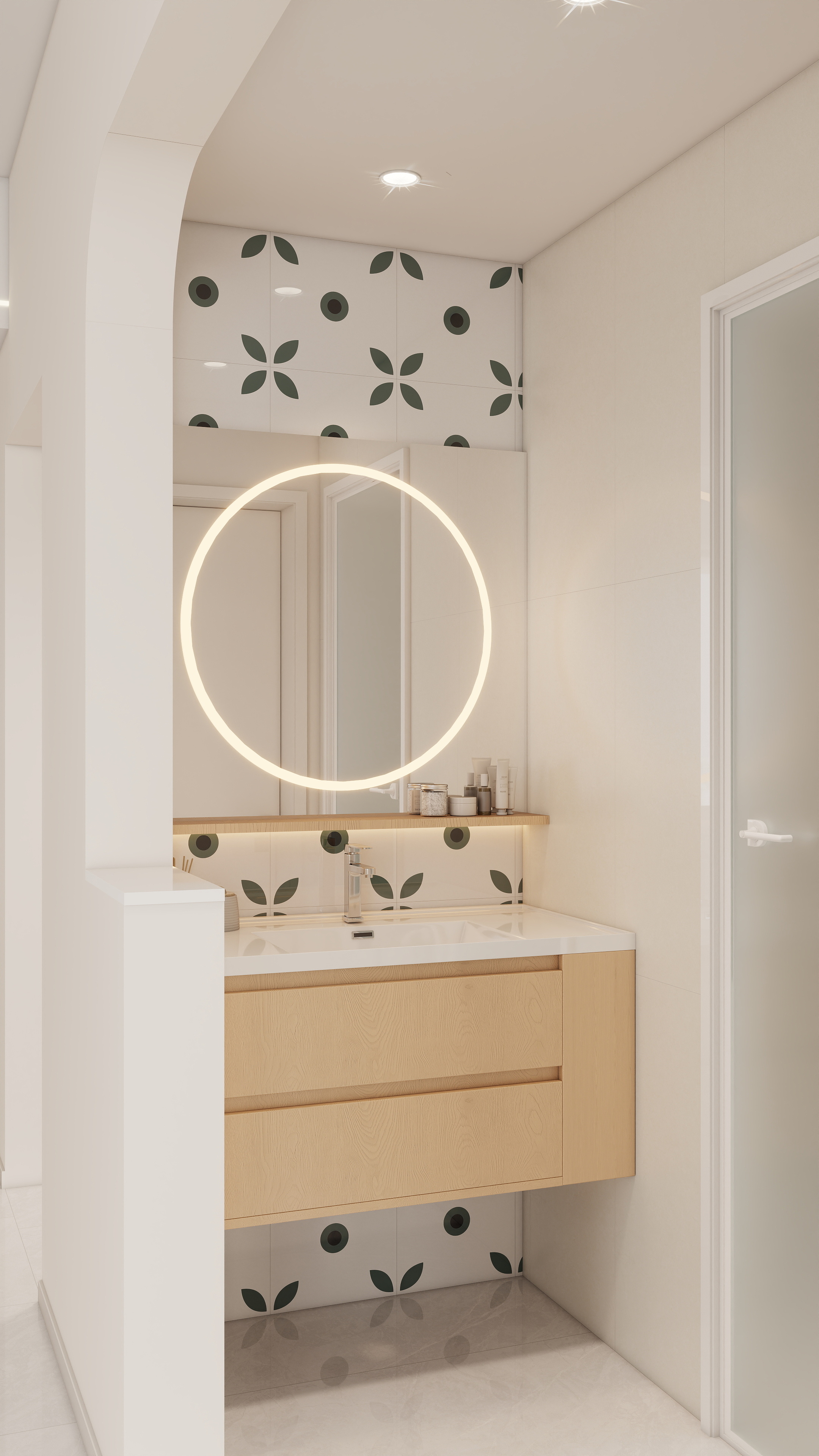 獨(dú)立干區(qū)設(shè)計(jì),將洗手臺(tái)外置,實(shí)現(xiàn)干濕分離,提升使用效率。圓形發(fā)光鏡面與淺色木質(zhì)柜體結(jié)合,現(xiàn)代感十足。局部采用綠色花紋瓷磚點(diǎn)綴,打破純白單調(diào),增添視覺(jué)趣味。鏡柜與懸空浴室柜提供充足儲(chǔ)物空間,便于清潔;臺(tái)面擺放少量裝飾品,平衡實(shí)用與美觀。鏡前燈環(huán)提供均勻面部照明,筒燈補(bǔ)充環(huán)境光,營(yíng)造明亮舒適的洗漱環(huán)境。