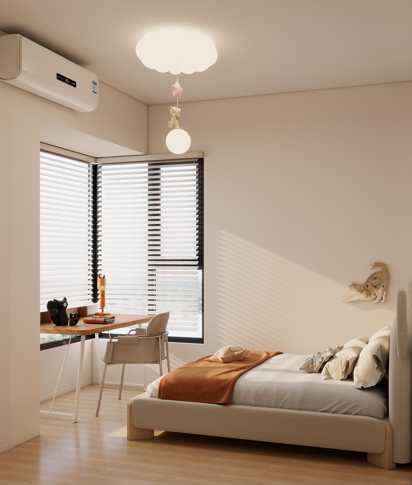 兒童房:床、書桌與裝飾元素緊湊排列,小戶型最大化利用有限空間。墻面裝飾與吊燈利用垂直空間,避免地面擁擠,保持通透感,天花板懸掛云朵造型燈具,搭配星星、動(dòng)物掛飾,營(yíng)造童趣氛圍。