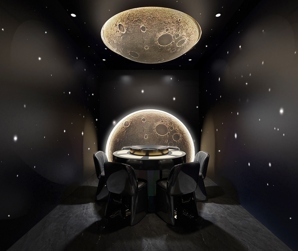 宇宙探秘風(fēng):以黑色為主色調(diào),搭配星星點點的燈光,模擬浩瀚宇宙。巨大的月球吊燈成為視覺中心,營造出神秘深邃的氛圍,讓玩家仿佛置身宇宙空間,非常適合科幻、懸疑類劇本,激發(fā)玩家的探索欲與想象力。