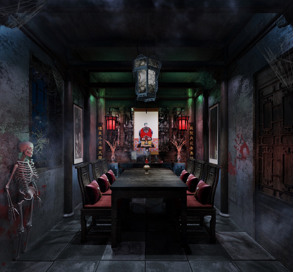 中式恐怖風(fēng):通過昏暗光線、蜘蛛網(wǎng)、骷髏模型、中式神龕等元素,營造出陰森恐怖的氛圍,為恐怖類劇本增添緊張刺激感。