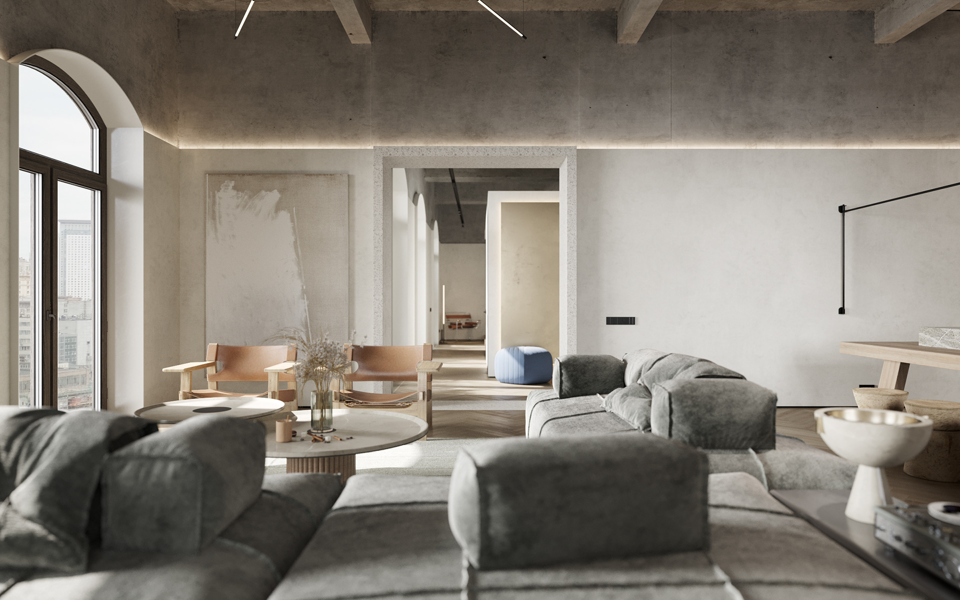 客廳:灰色的大型組合沙發(fā)成為客廳的視覺(jué)中心,其柔軟的質(zhì)感和低矮的造型為空間增添了舒適感與穩(wěn)重感。木質(zhì)與皮質(zhì)結(jié)合的單人椅,在材質(zhì)上形成對(duì)比,豐富了空間的層次感,墻上的抽象藝術(shù)畫(huà)作以簡(jiǎn)潔的線條和中性色調(diào),與整體工業(yè)風(fēng)相契合,增添了藝術(shù)氛圍。圓形的木質(zhì)茶幾搭配干花裝飾,帶來(lái)自然氣息,中和了工業(yè)風(fēng)的冷硬感。