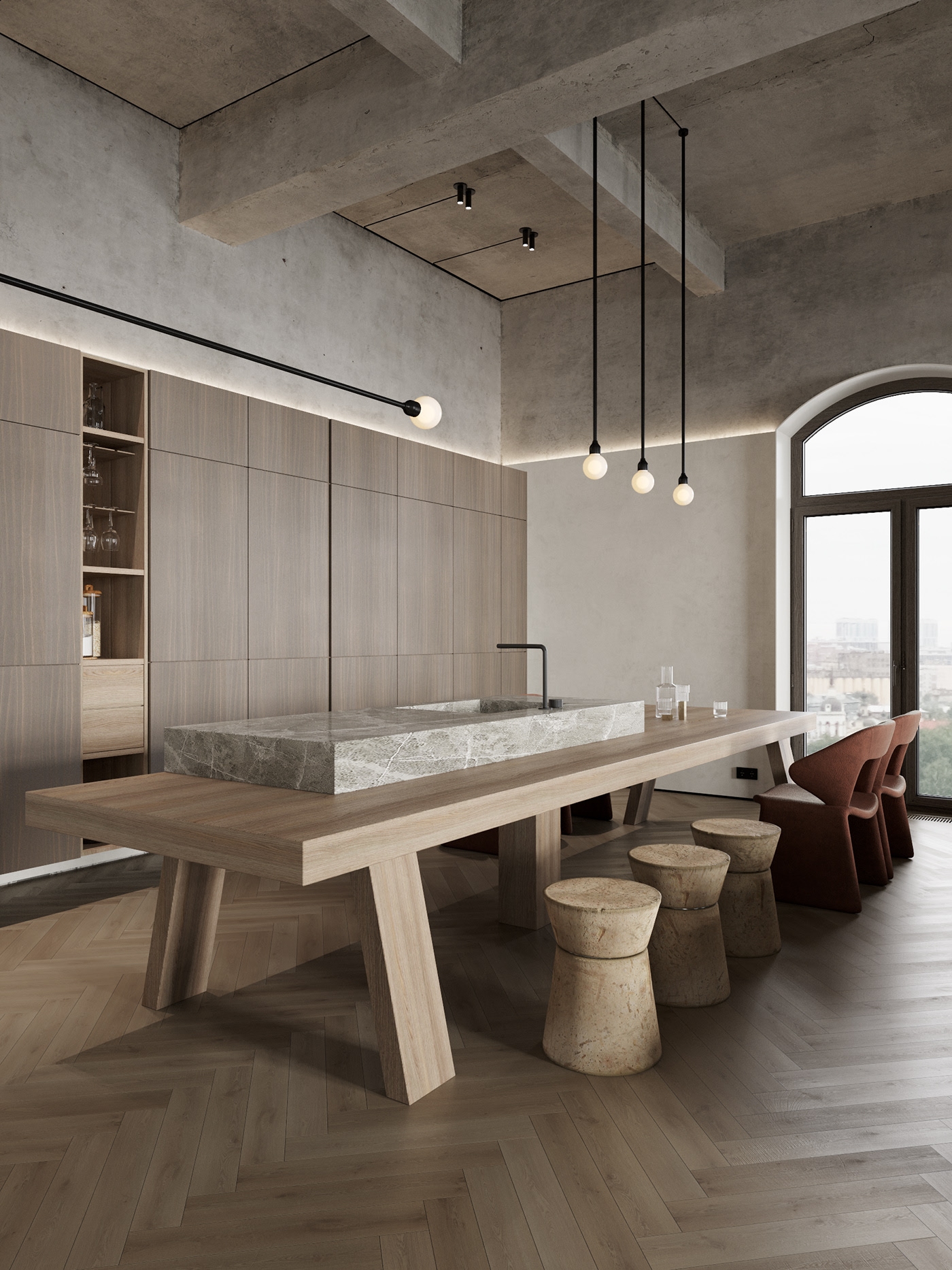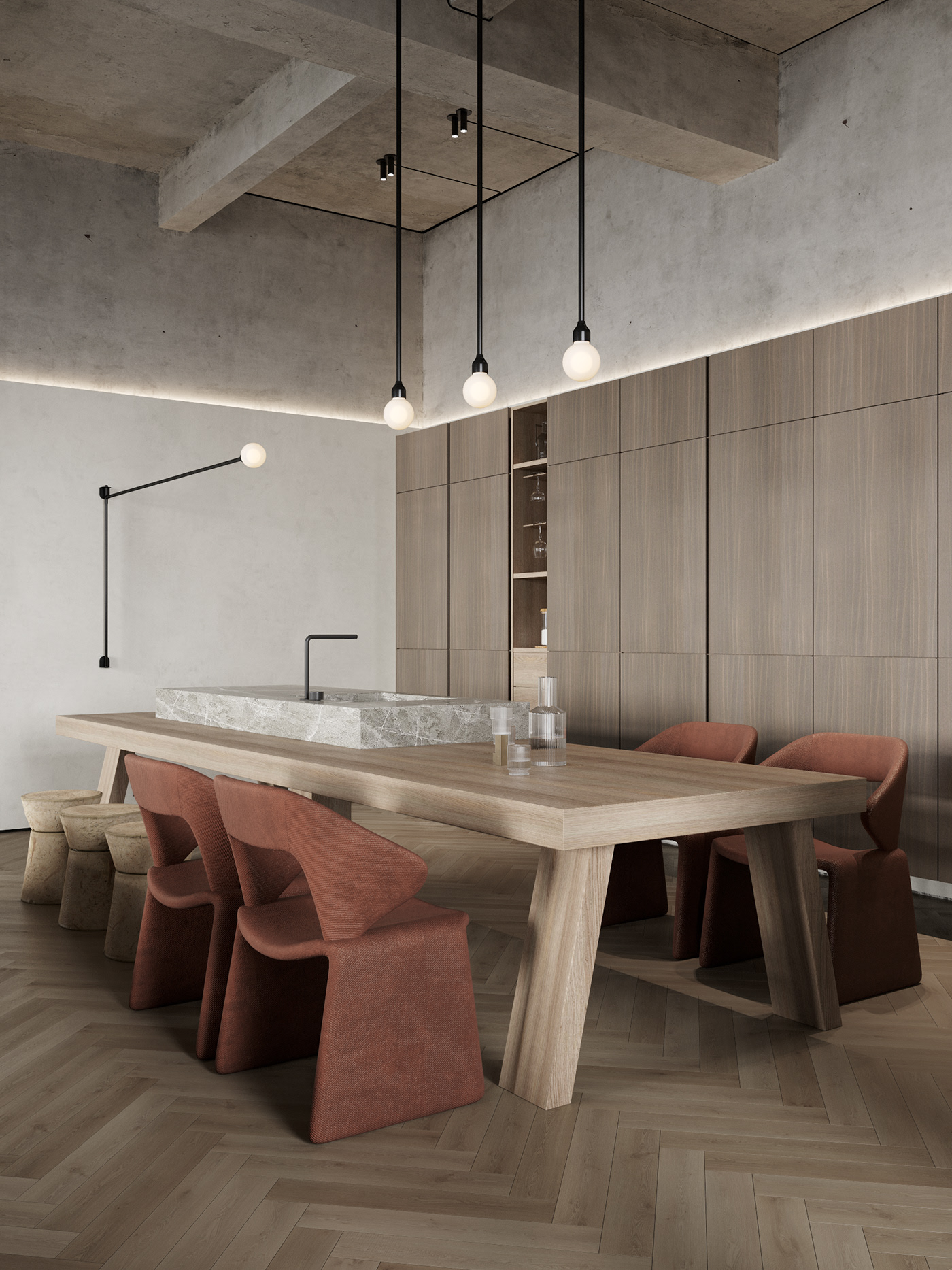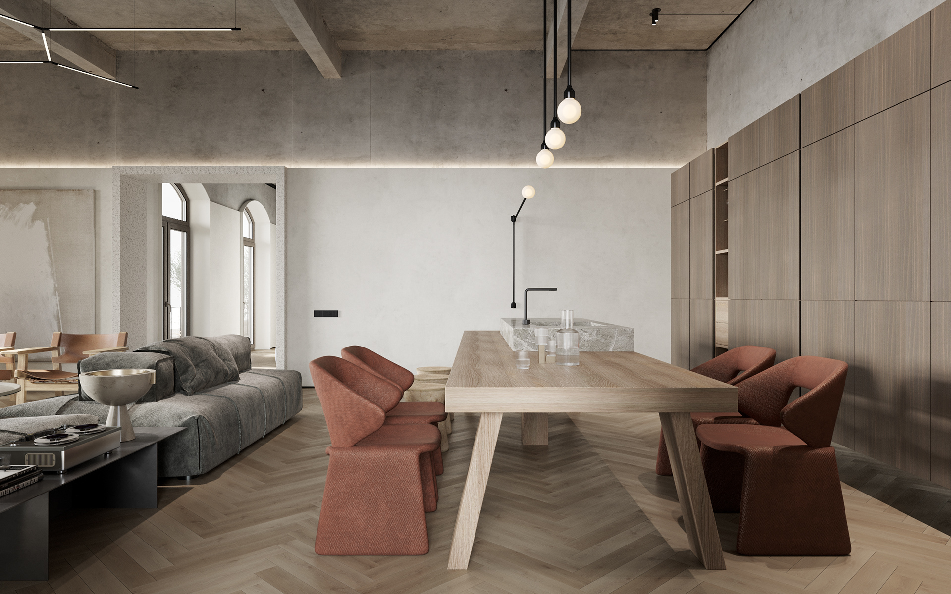 餐廳:長(zhǎng)方形的木質(zhì)餐桌具有獨(dú)特的紋理和自然的質(zhì)感,搭配造型獨(dú)特的磚形凳和橙紅色的椅子,色彩與材質(zhì)的碰撞為空間注入了活力與個(gè)性。黑色的吊燈以簡(jiǎn)約的球形燈罩和細(xì)長(zhǎng)的吊線,營(yíng)造出聚焦的用餐氛圍,同時(shí)黑色的燈具與整體工業(yè)風(fēng)格相呼應(yīng)。一側(cè)的木質(zhì)收納柜不僅提供了充足的儲(chǔ)物空間,其簡(jiǎn)潔的線條和木質(zhì)的溫暖感還平衡了混凝土的冷硬,使空間更加和諧。
