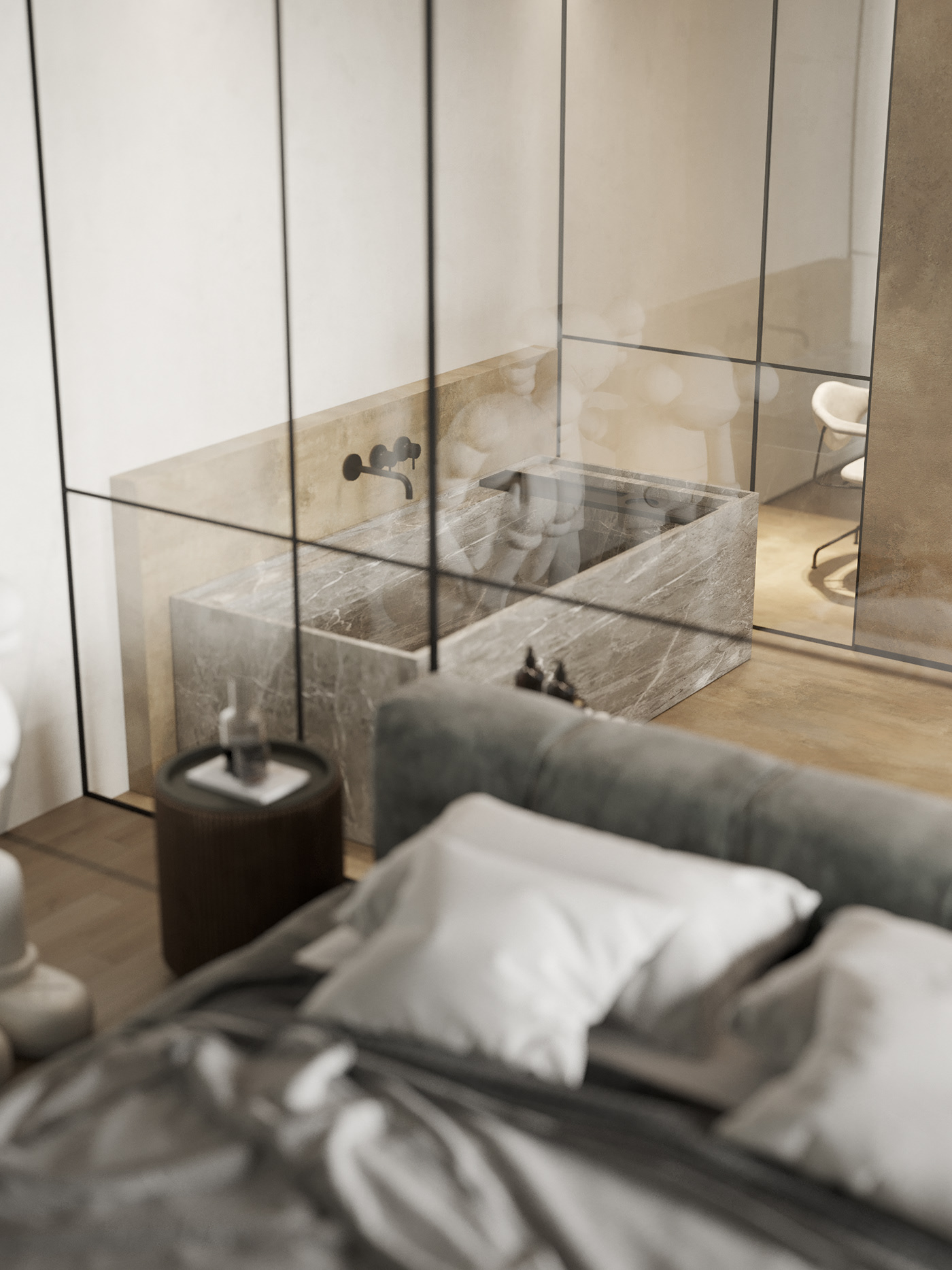 臥室:低矮的灰色軟床給人以舒適、放松的感覺(jué),搭配白色的枕頭和灰色的毯子,色調(diào)統(tǒng)一且寧?kù)o。床邊的木質(zhì)床頭柜與整體木質(zhì)元素相呼應(yīng),增添了自然溫馨的氛圍。臥室與衛(wèi)生間之間采用玻璃隔斷,增加了空間的通透感和視覺(jué)延伸性,同時(shí)也讓臥室顯得更加寬敞明亮。白色的藝術(shù)雕塑為臥室增添了一份藝術(shù)氣息和趣味性,成為空間中的視覺(jué)亮點(diǎn)。
