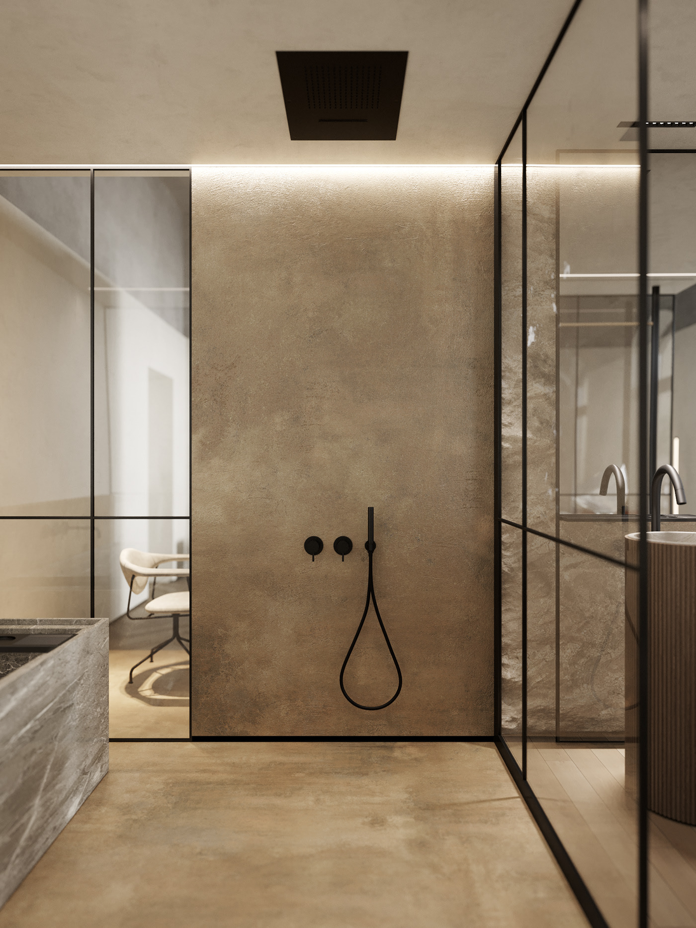 衛(wèi)生間:墻面和地面采用相同質(zhì)感的材料,整體性強(qiáng)。黑色的淋浴配件與玻璃隔斷相結(jié)合,簡(jiǎn)潔而時(shí)尚,展現(xiàn)出工業(yè)風(fēng)的精致與實(shí)用。合理的功能分區(qū),淋浴區(qū)、洗漱區(qū)一目了然,玻璃隔斷有效實(shí)現(xiàn)了干濕分離,保證了衛(wèi)生間的整潔與實(shí)用。