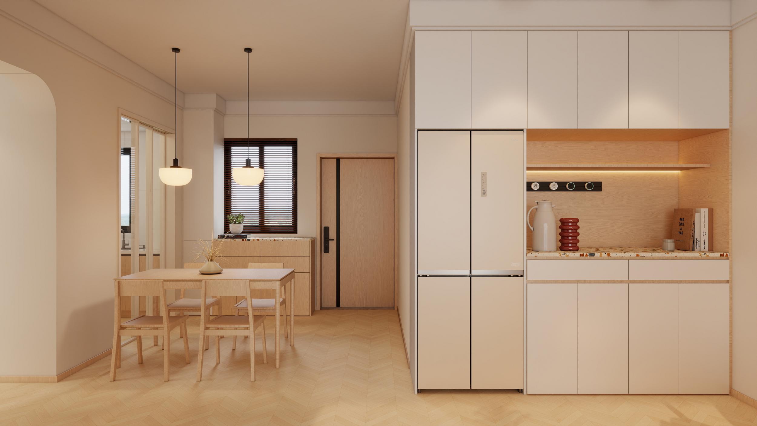 客餐廳:整體為原木奶油風(fēng),搭配拱形埡口與人字拼地板,溫柔治愈又帶法式浪漫感