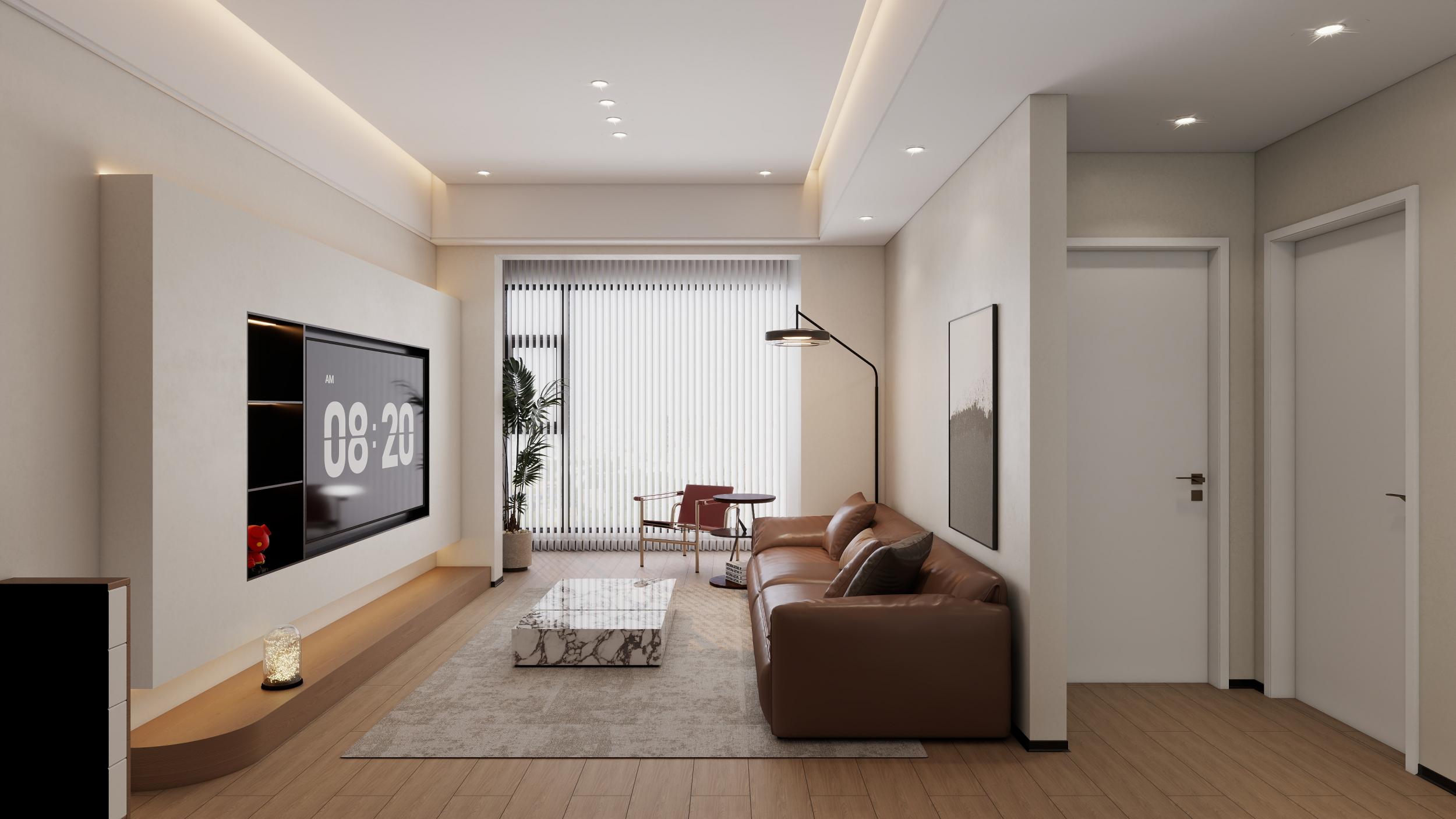 客廳:現(xiàn)代簡(jiǎn)約原木風(fēng),奶咖皮沙發(fā)搭配大理石茶幾,無主燈 + 線性吊燈,黑白裝飾畫點(diǎn)綴,空間開闊,營造松弛高級(jí)的居家氛圍。